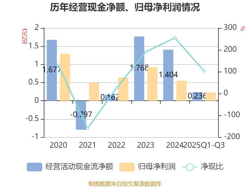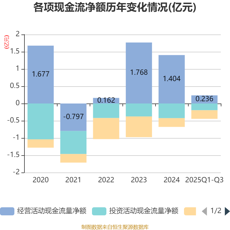 2025年前三季度,公司经营活动现金流净额为2363.48万元,同比下降66.41%;筹资活动现金流净额-2486.89万元,同比增加46.5万元;投资活动现金流净额-1948.26万元,上年同期为-3177.59万元。