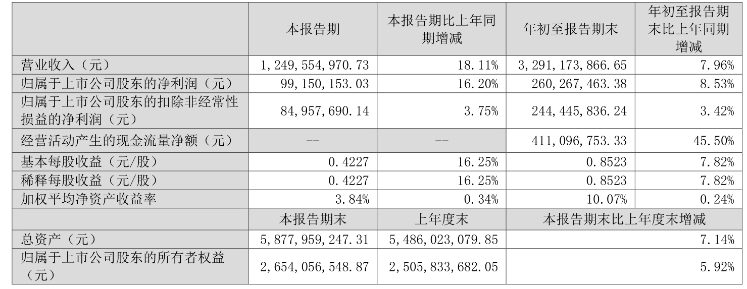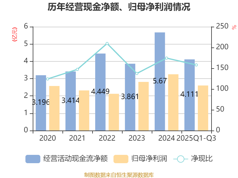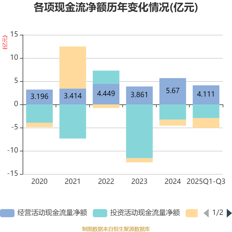 2025年前三季度,公司经营活动现金流净额为4.11亿元,同比增长45.5%;筹资活动现金流净额-2.14亿元,同比减少8821.63万元;投资活动现金流净额-2.94亿元,上年同期为-1.24亿元。