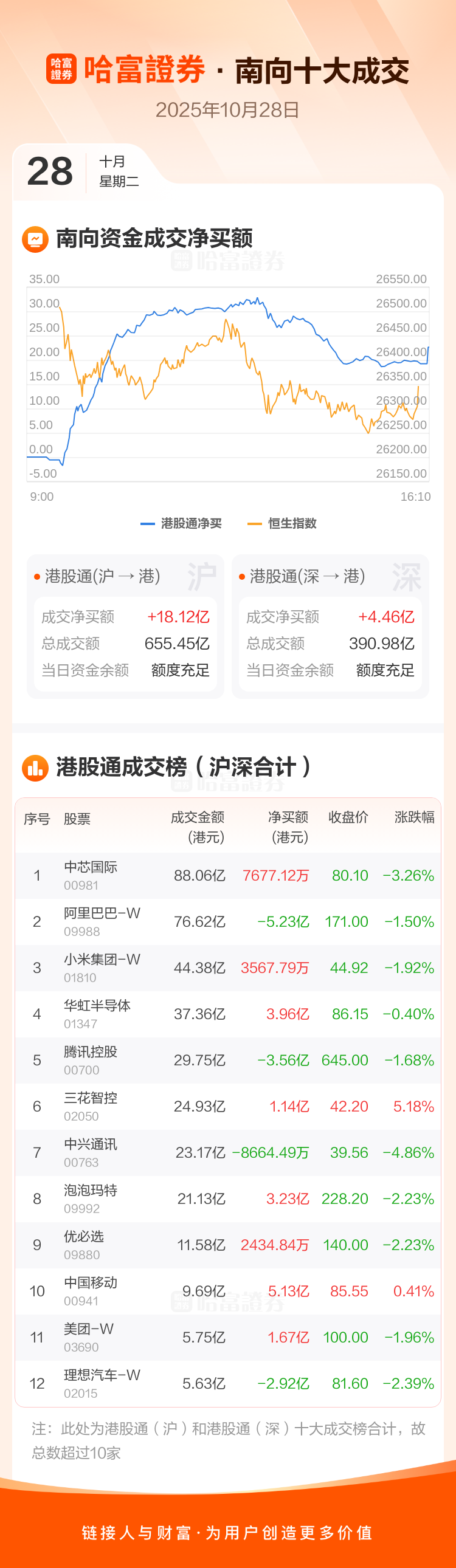 恒生指数10月28日跌0.33%,收报26346.14点。南向资金今日净买入港股22.58亿港元。南向资金今日成交额1046.44亿港元,港股大市成交2427.00亿港元。