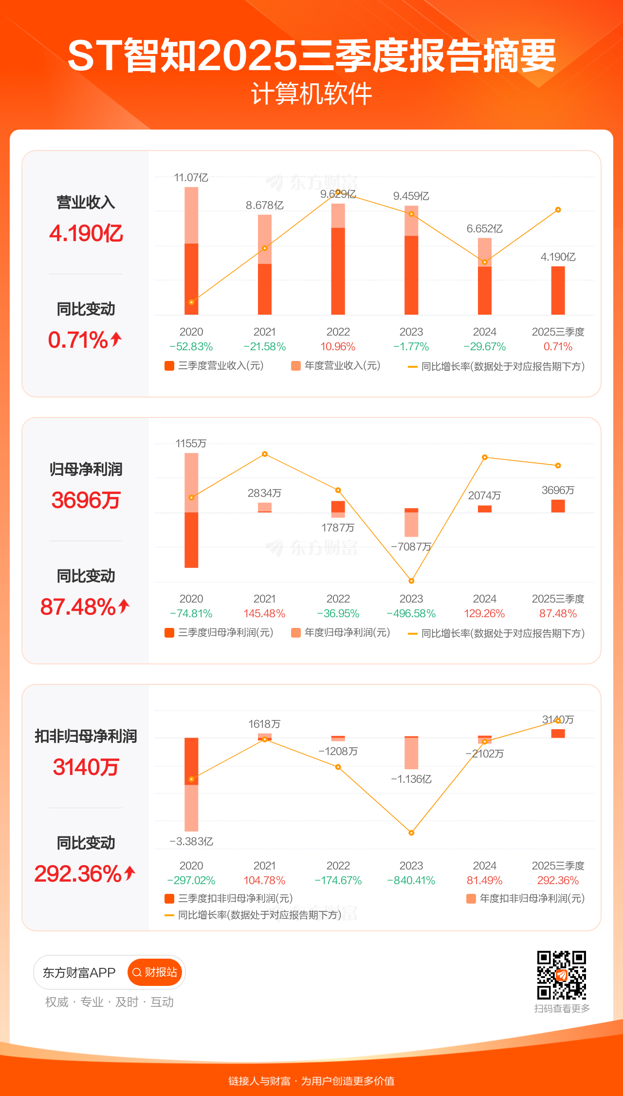 ST智知10月29日发布2025年三季报显示,公司前三季实现营业收入4.19亿元,同比增长0.71%;归母净利润3695.80万元,同比增长87.48%;扣非归母净利润3140.34万元,同比增长292.36%。