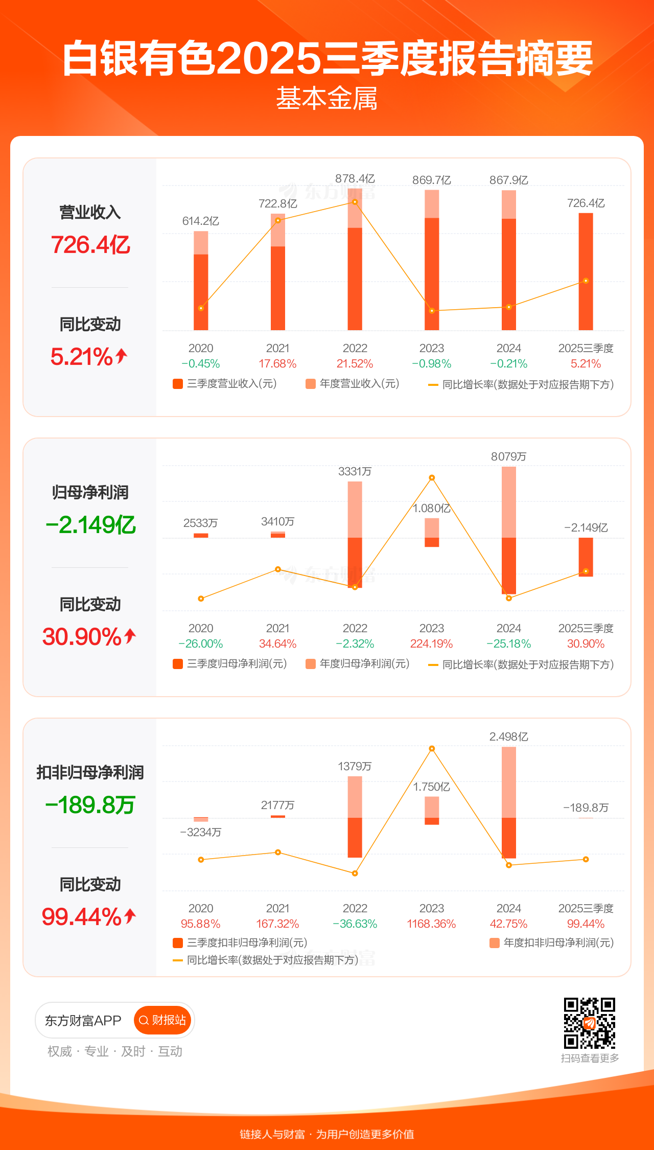 白银有色10月29日发布2025年三季报显示,公司前三季实现营业收入726.43亿元,同比增长5.21%;归母净利润-2.15亿元;扣非归母净利润-189.82万元。