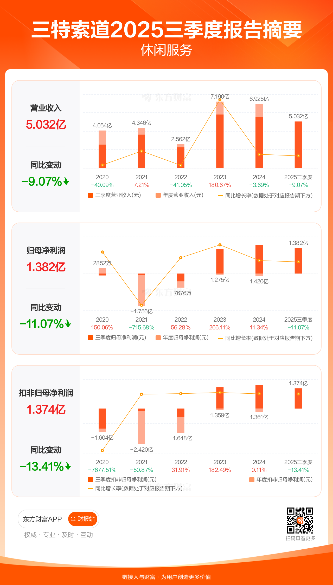 三特索道10月29日发布2025年三季报显示,公司前三季实现营业收入5.03亿元,同比下滑9.07%;归母净利润1.38亿元,同比下滑11.07%;扣非归母净利润1.37亿元,同比下滑13.41%。