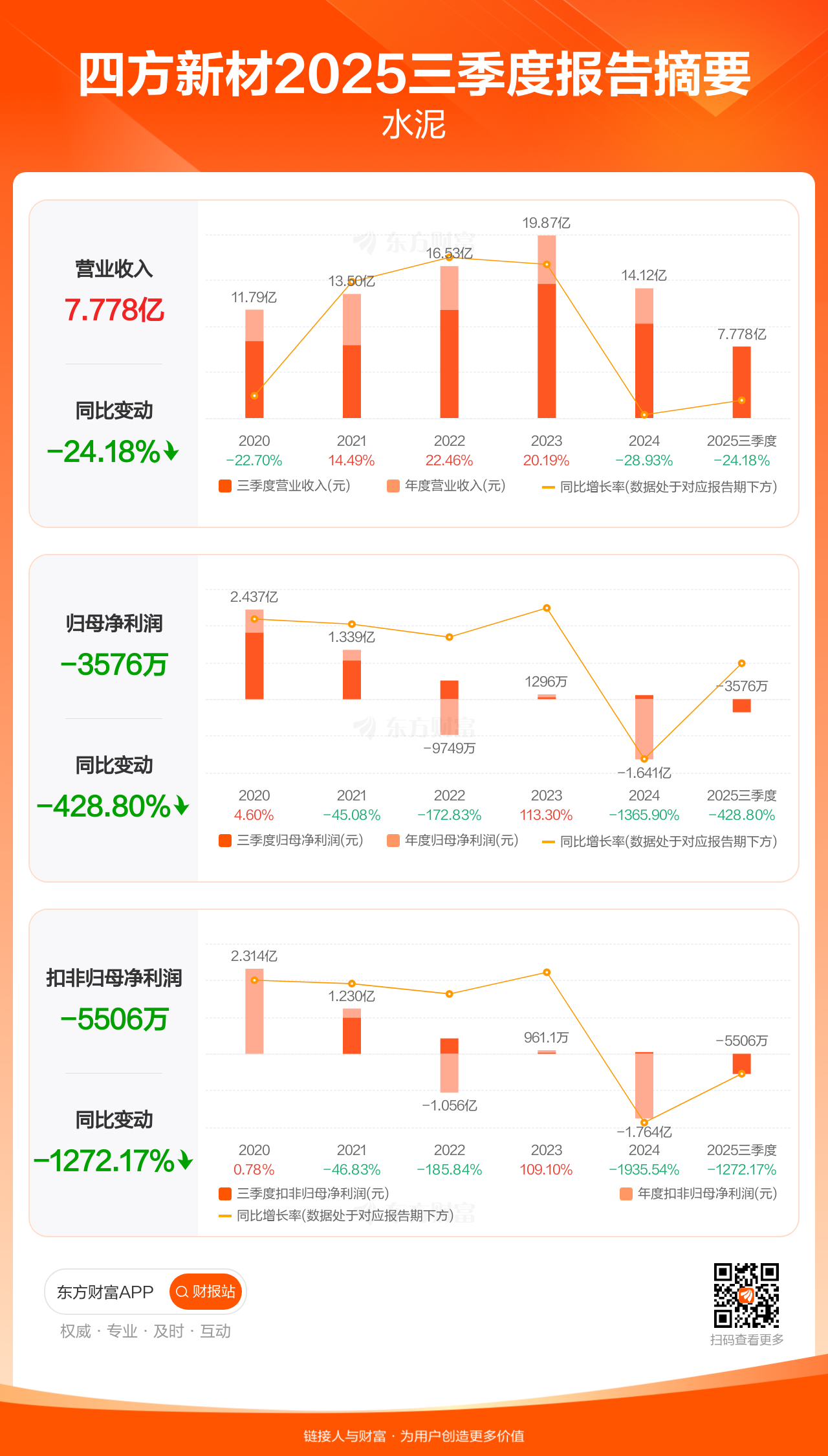 四方新材10月29日发布2025年三季报显示,公司前三季实现营业收入7.78亿元,同比下滑24.18%;归母净利润-3576.32万元;扣非归母净利润-5505.85万元。