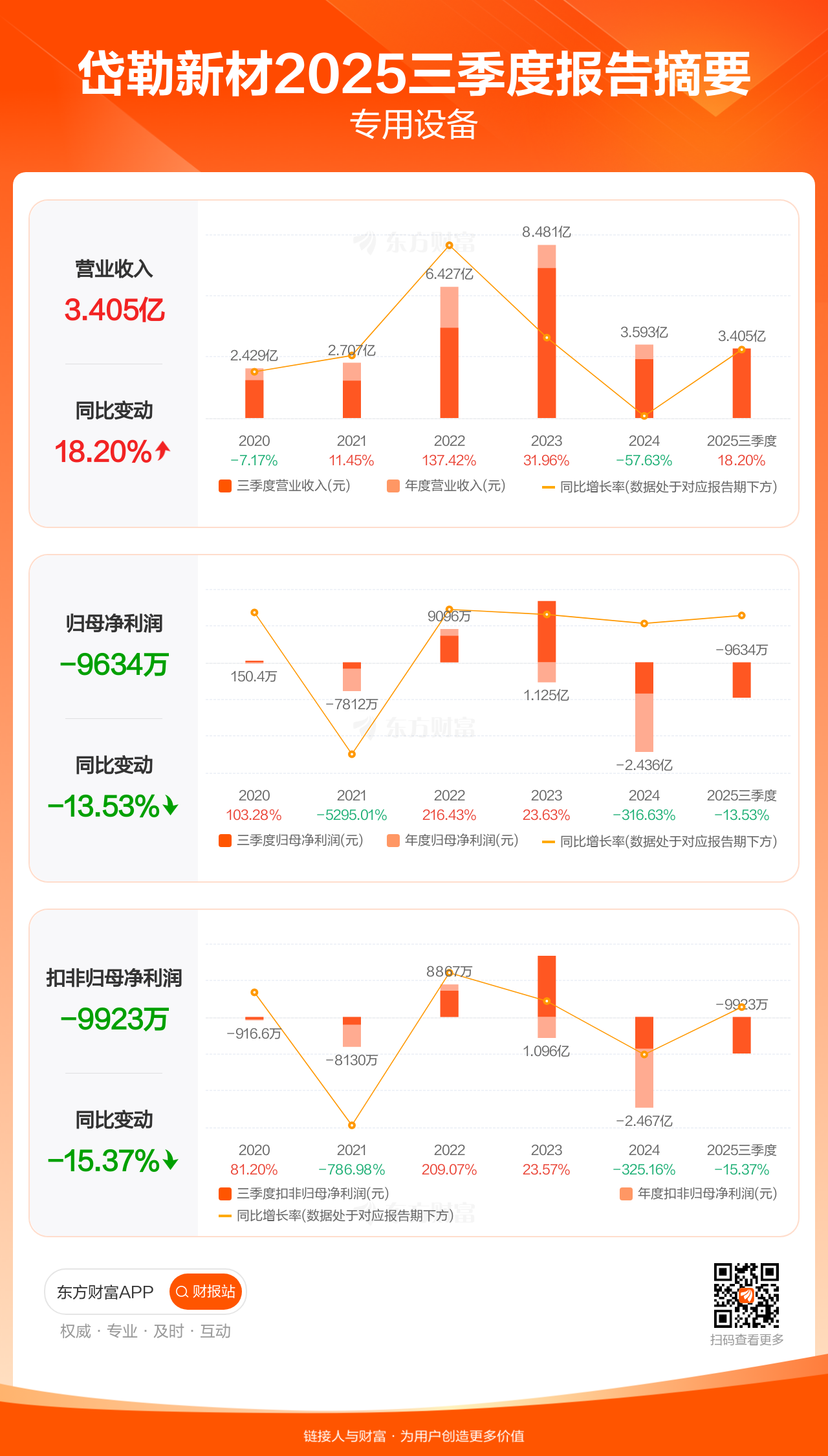 岱勒新材10月29日发布2025年三季报显示,公司前三季实现营业收入3.40亿元,同比增长18.20%;归母净利润-9634.38万元;扣非归母净利润-9922.96万元。