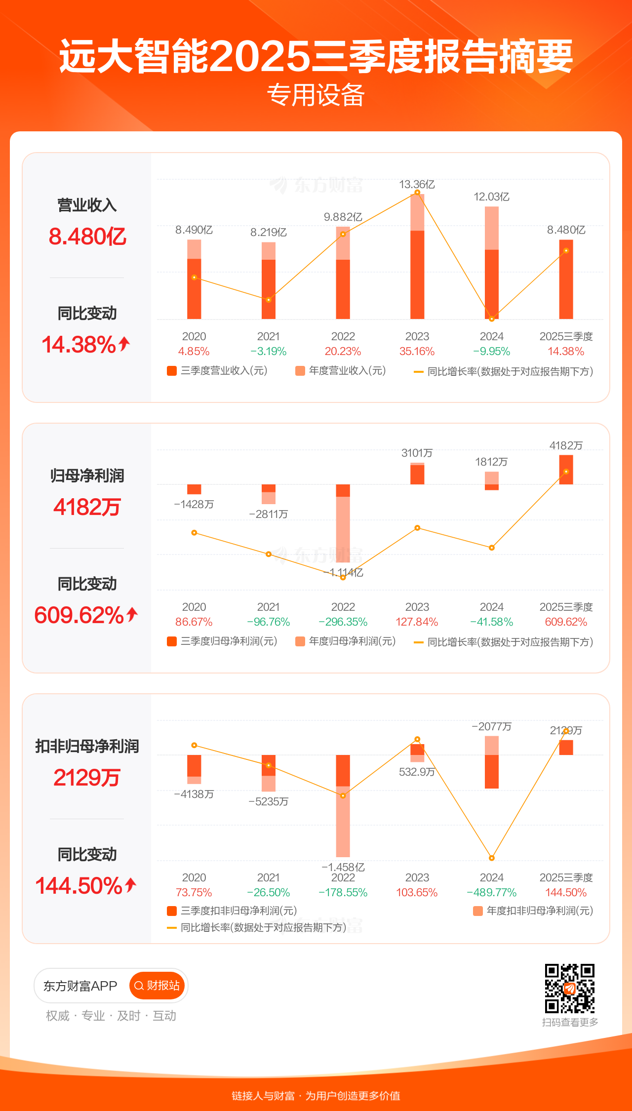 远大智能10月29日发布2025年三季报显示,公司前三季实现营业收入8.48亿元,同比增长14.38%;归母净利润4182.04万元,同比增长609.62%;扣非归母净利润2128.53万元,同比增长144.50%。