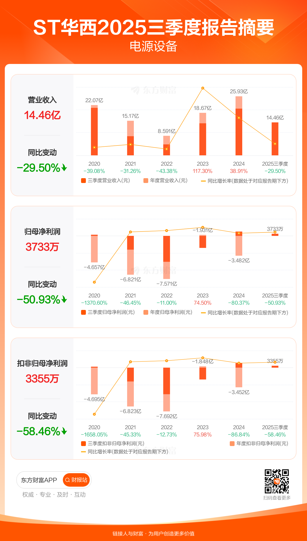 ST华西10月29日发布2025年三季报显示,公司前三季实现营业收入14.46亿元,同比下滑29.50%;归母净利润3732.75万元,同比下滑50.93%;扣非归母净利润3355.09万元,同比下滑58.46%。