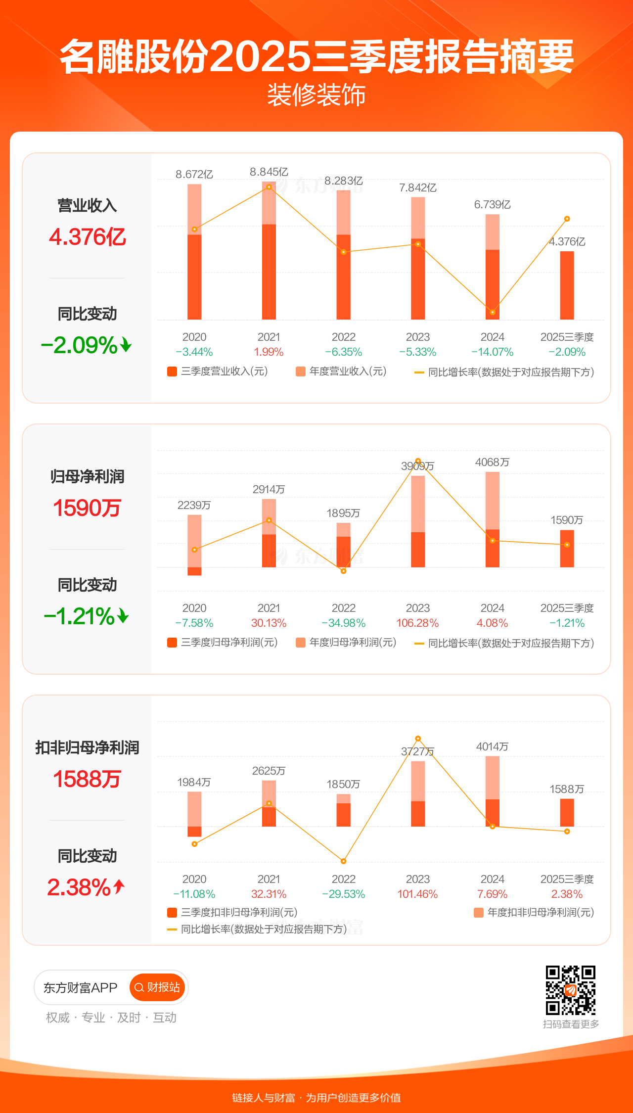 名雕股份10月29日发布2025年三季报显示,公司前三季实现营业收入4.38亿元,同比下滑2.09%;归母净利润1590.49万元,同比下滑1.21%;扣非归母净利润1587.86万元,同比增长2.38%。