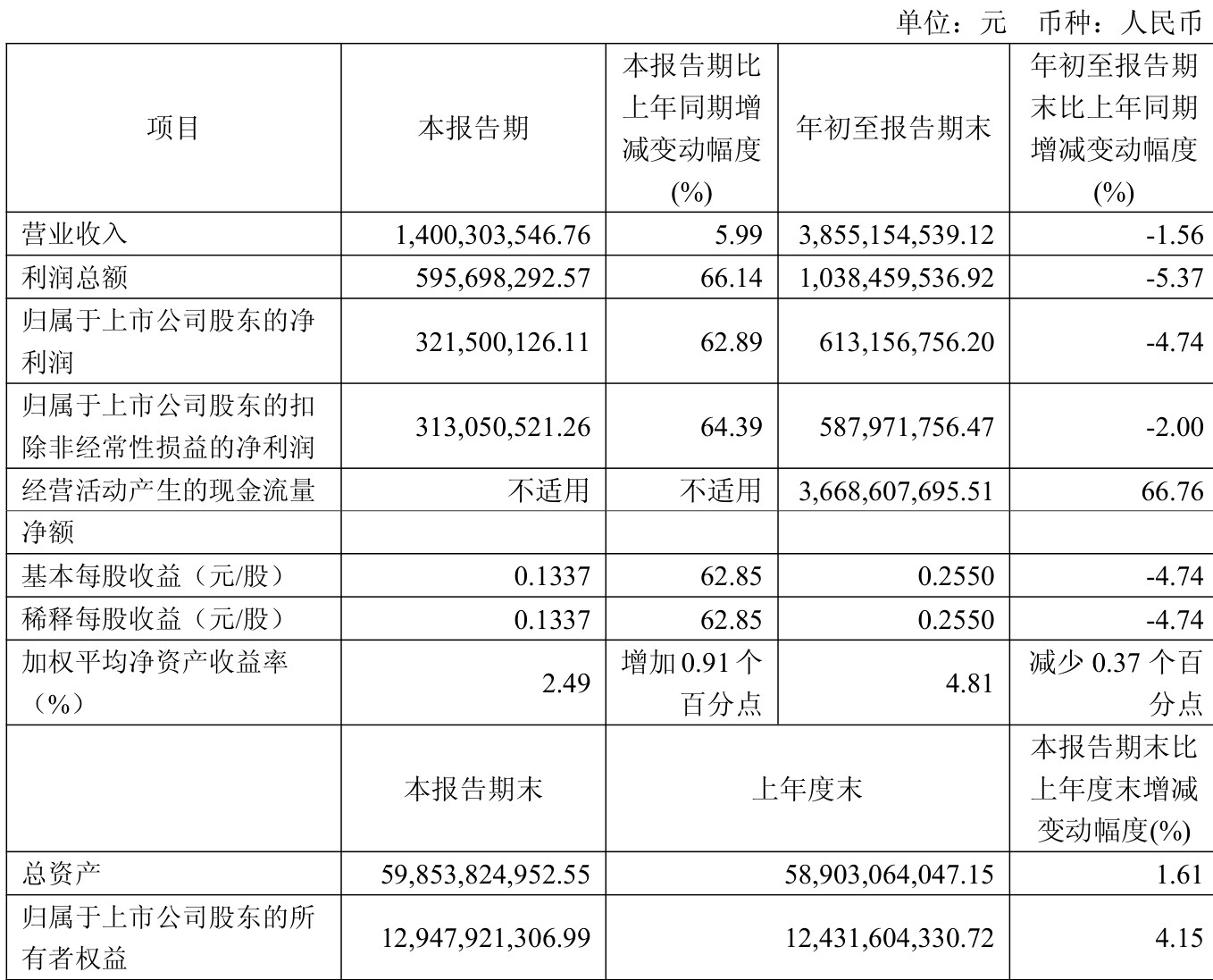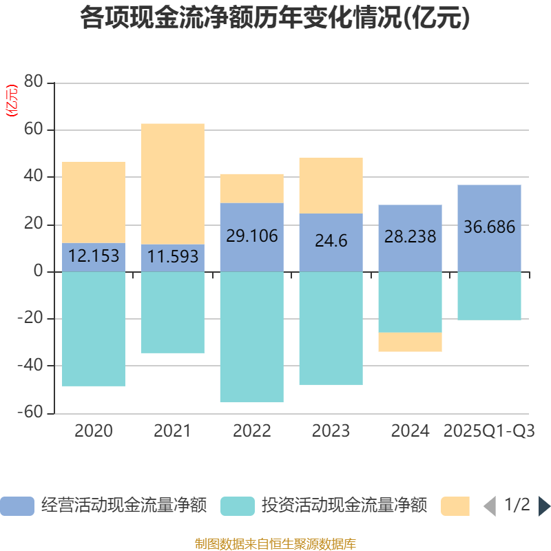 2025年前三季度,公司经营活动现金流净额为36.69亿元,同比增长66.76%;筹资活动现金流净额-223.11万元,同比增加8.63亿元;投资活动现金流净额-20.59亿元,上年同期为-10.91亿元。