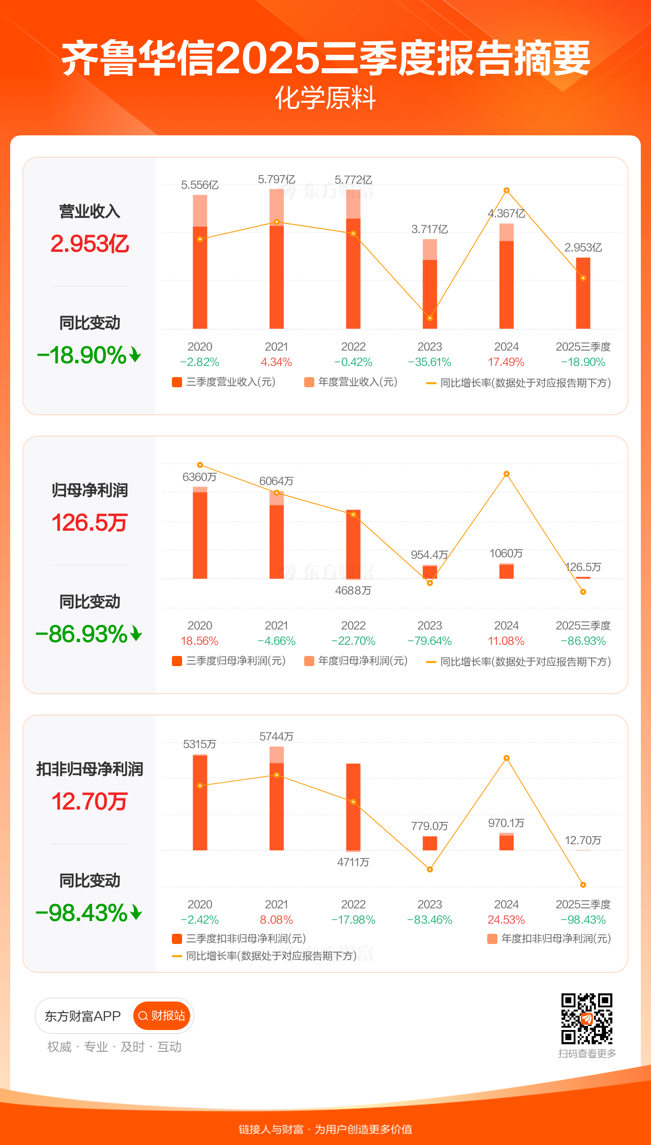 齐鲁华信10月28日发布2025年三季报显示,公司前三季实现营业收入2.95亿元,同比下滑18.90%;归母净利润126.49万元,同比下滑86.93%;扣非归母净利润12.70万元,同比下滑98.43%。