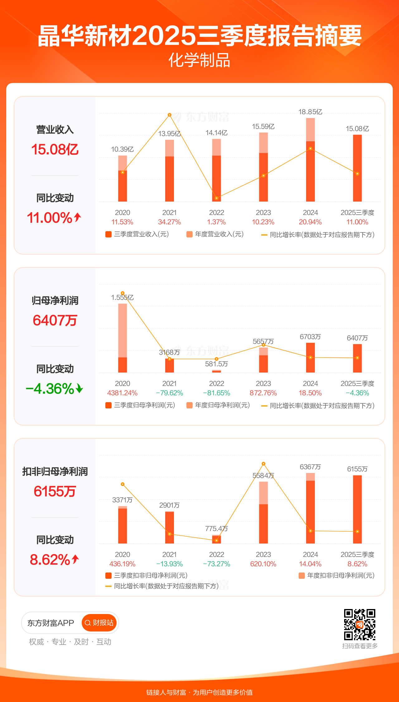 晶华新材10月29日发布2025年三季报显示,公司前三季实现营业收入15.08亿元,同比增长11.00%;归母净利润6407.27万元,同比下滑4.36%;扣非归母净利润6155.08万元,同比增长8.62%。