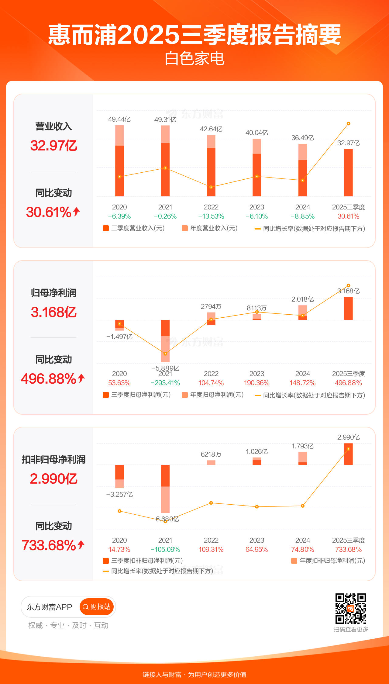 惠而浦10月29日发布2025年三季报显示,公司前三季实现营业收入32.97亿元,同比增长30.61%;归母净利润3.17亿元,同比增长496.88%;扣非归母净利润2.99亿元,同比增长733.68%。