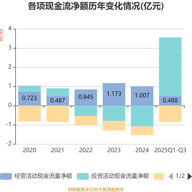 2025年前三季度,公司经营活动现金流净额为4881.02万元,同比下降37.89%;筹资活动现金流净额-8556万元,同比减少4260.89万元;投资活动现金流净额3.06亿元,上年同期为-1.18亿元。