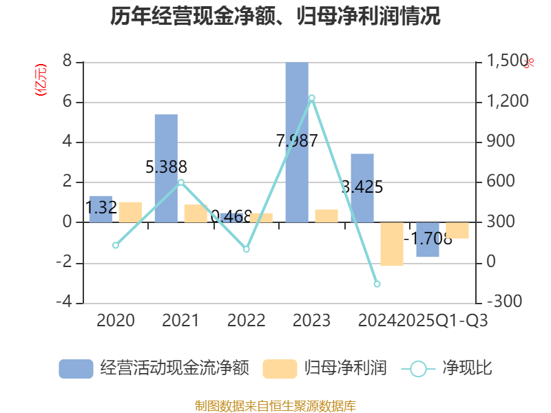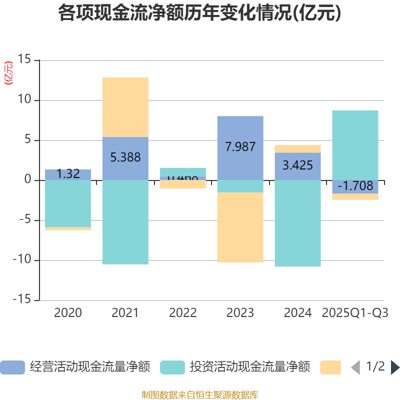 2025年前三季度,公司经营活动现金流净额为-1.71亿元,同比减少7374.36万元;筹资活动现金流净额-7736.56万元,同比减少2.74亿元;投资活动现金流净额8.7亿元,上年同期为-2.44亿元。