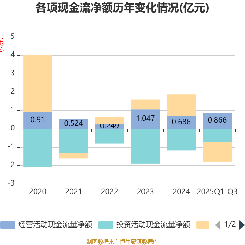 2025年前三季度,公司经营活动现金流净额为8663.38万元,同比增长66.14%;筹资活动现金流净额-1.07亿元,同比减少2.19亿元;投资活动现金流净额-7313.32万元,上年同期为-5377.03万元。