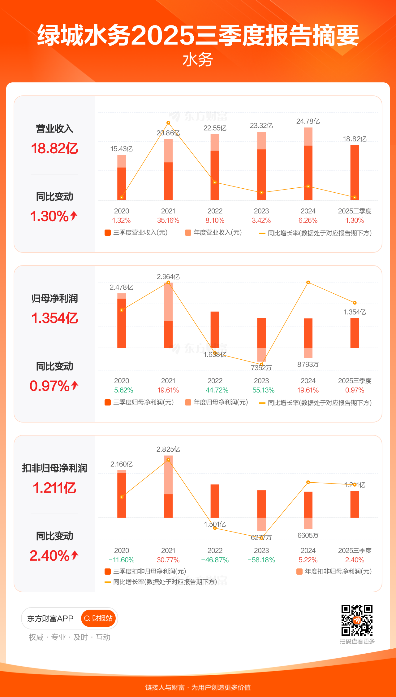 绿城水务10月29日发布2025年三季报显示,公司前三季实现营业收入18.82亿元,同比增长1.30%;归母净利润1.35亿元,同比增长0.97%;扣非归母净利润1.21亿元,同比增长2.40%。