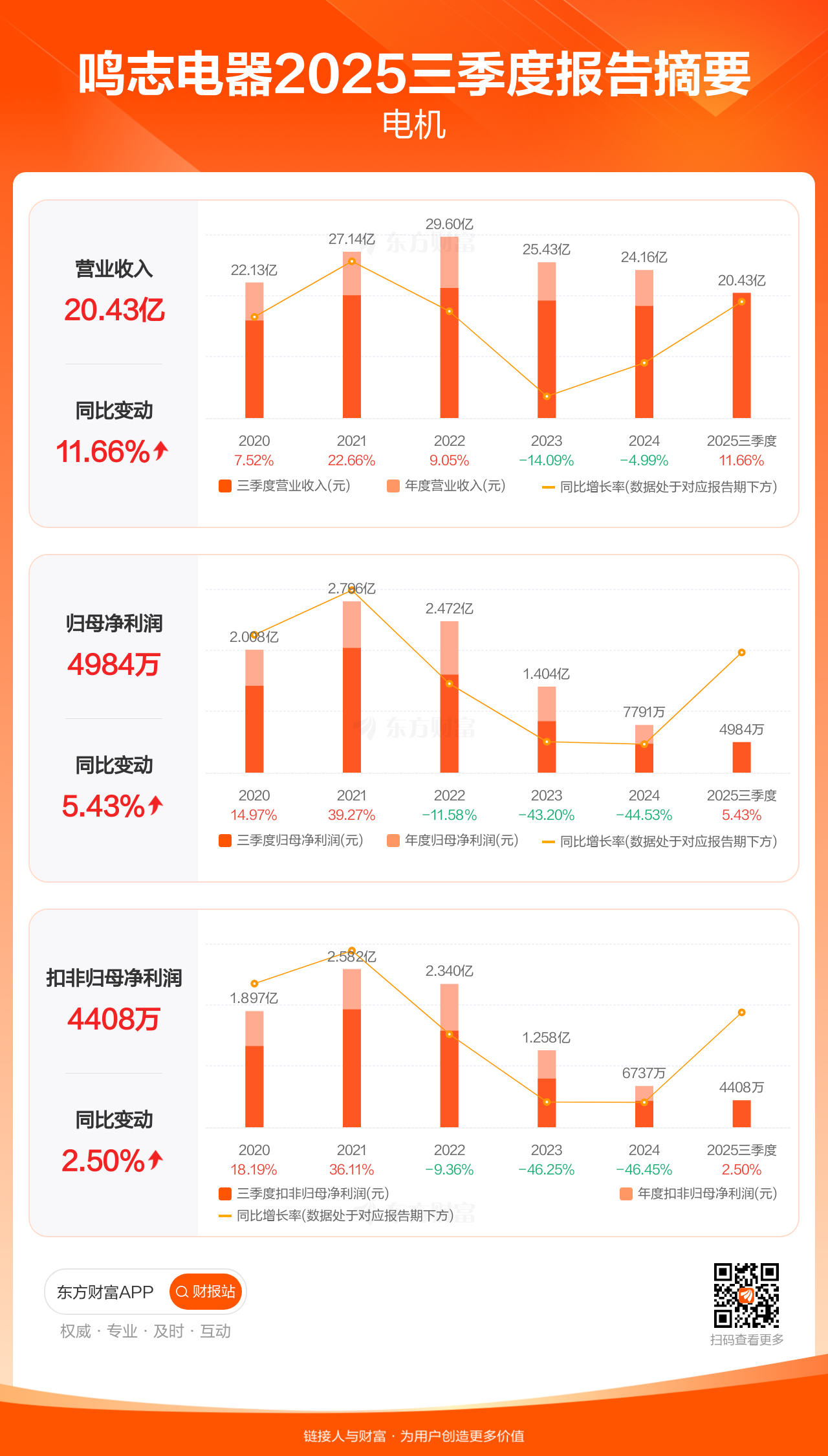 鸣志电器10月29日发布2025年三季报显示,公司前三季实现营业收入20.43亿元,同比增长11.66%;归母净利润4983.79万元,同比增长5.43%;扣非归母净利润4408.42万元,同比增长2.50%。