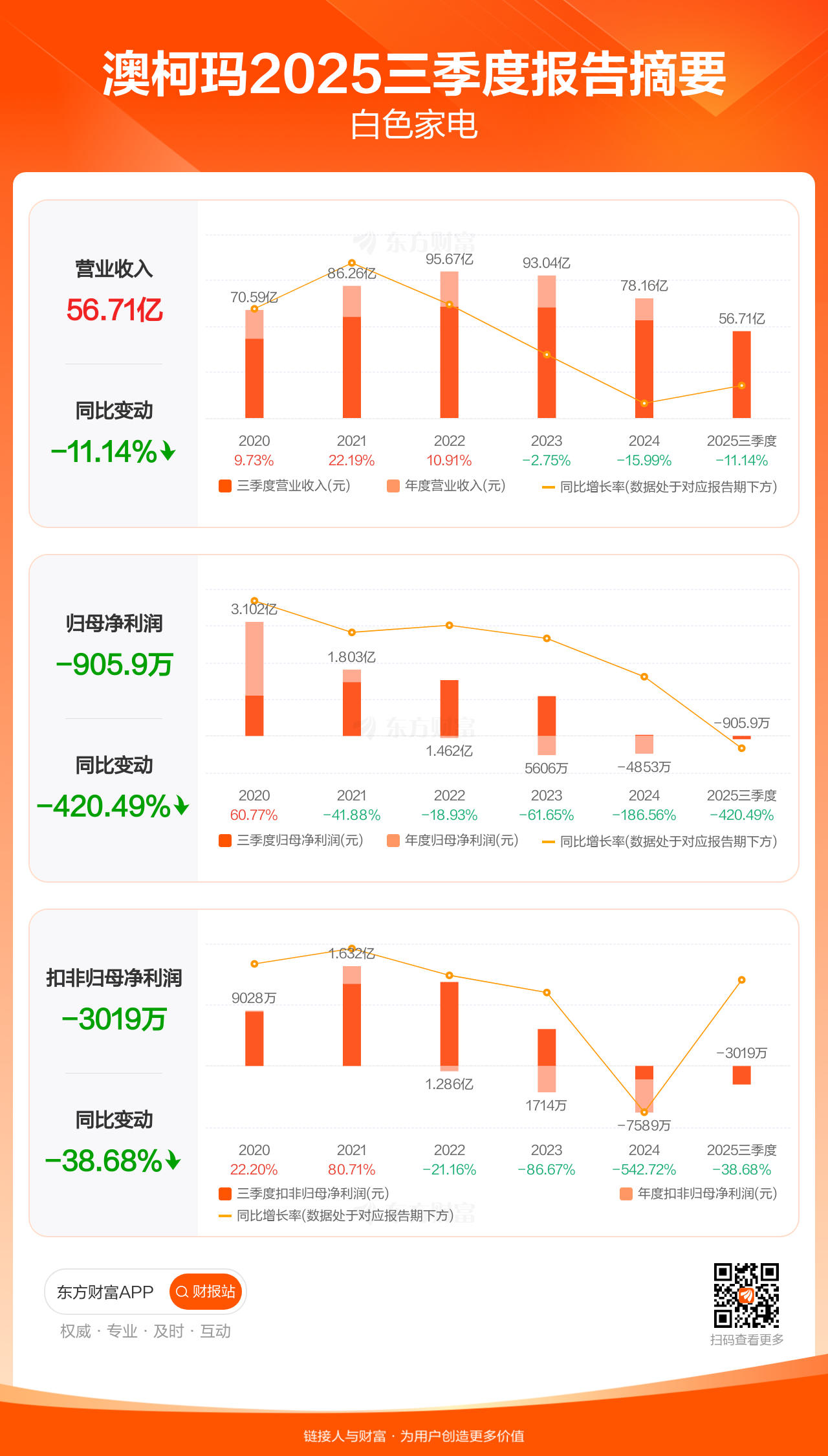 澳柯玛10月29日发布2025年三季报显示,公司前三季实现营业收入56.71亿元,同比下滑11.14%;归母净利润-905.91万元;扣非归母净利润-3019.49万元。
