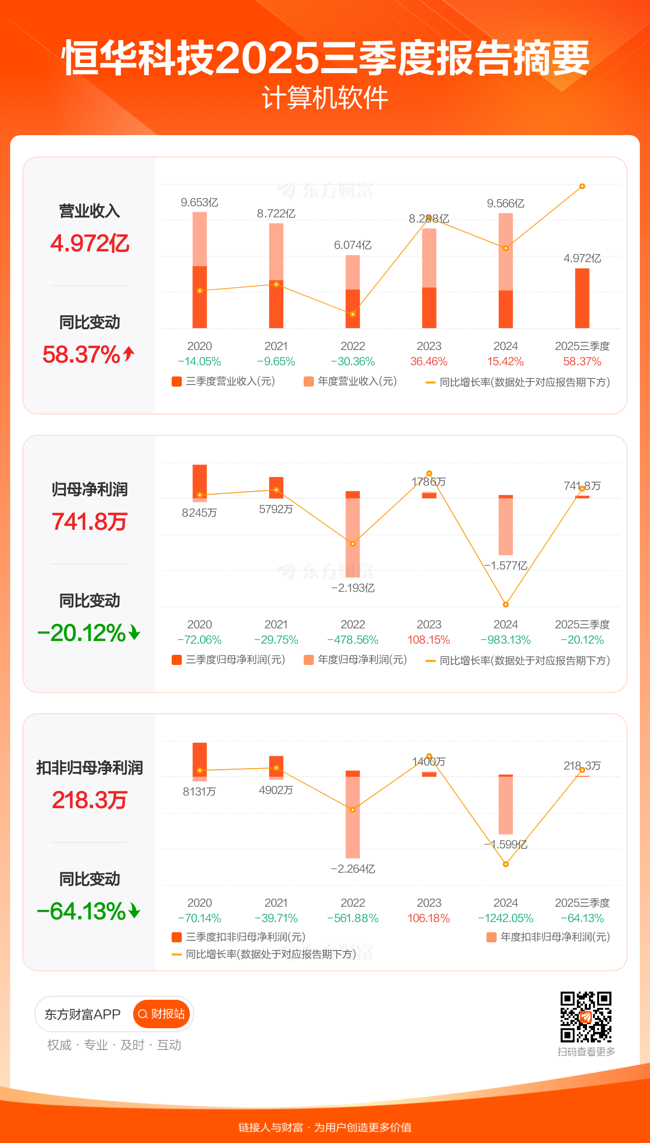 恒华科技10月29日发布2025年三季报显示,公司前三季实现营业收入4.97亿元,同比增长58.37%;归母净利润741.85万元,同比下滑20.12%;扣非归母净利润218.25万元,同比下滑64.13%。