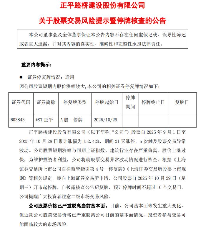 *ST正平:公司股票交易存在异常波动 将停牌核查