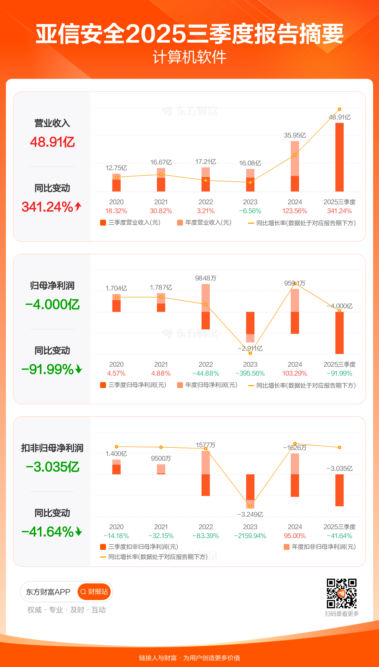 亚信安全10月29日发布2025年三季报显示,公司前三季实现营业收入48.91亿元,同比增长341.24%;归母净利润-4.00亿元;扣非归母净利润-3.04亿元。