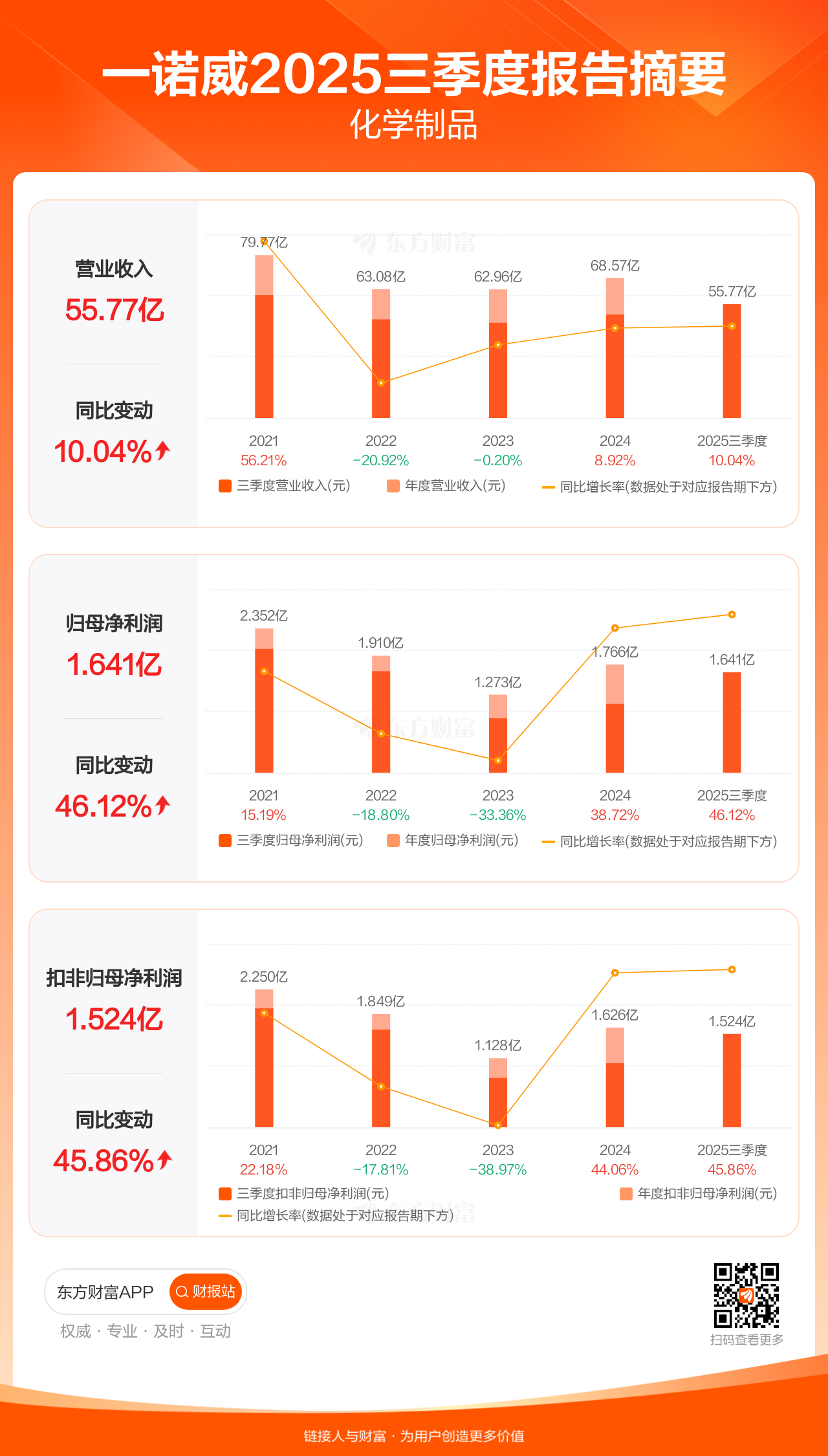 一诺威10月28日发布2025年三季报显示,公司前三季实现营业收入55.77亿元,同比增长10.04%;归母净利润1.64亿元,同比增长46.12%;扣非归母净利润1.52亿元,同比增长45.86%。