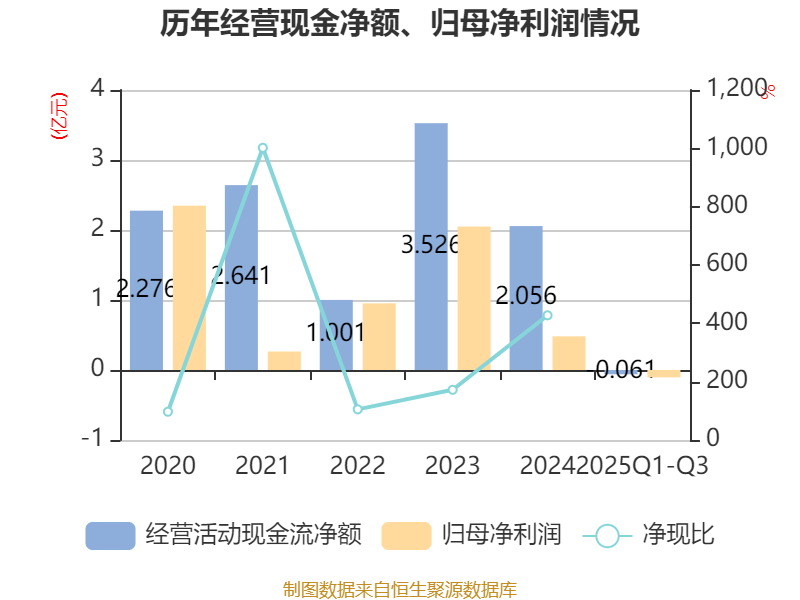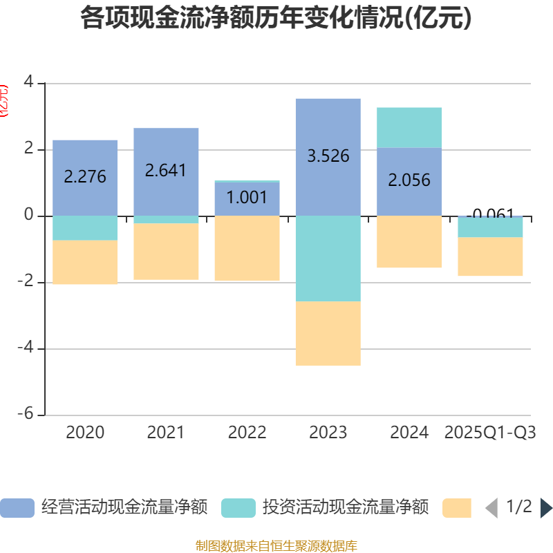 2025年前三季度,公司经营活动现金流净额为-606.62万元,同比增加349.37万元;筹资活动现金流净额-1.16亿元,同比增加3229.93万元;投资活动现金流净额-5960.71万元,上年同期为2.3亿元。