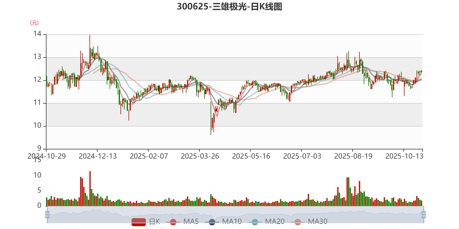 中证智能财讯三雄极光(300625)10月29日披露2025年第三季度报告。前三季度公司实现营业总收入13.32亿元,同比下降10.78%;归母净利润亏损1049.78万元,上年同期盈利6135.58万元;扣非净利润亏损3242.23万元,上年同期盈利3747.8万元;经营活动产生的现金流量净额为-606.62万元,上年同期为-955.99万元;报告期内,三雄极光基本每股收益为-0.0376元,加权平均净资产收益率为-1.56%。