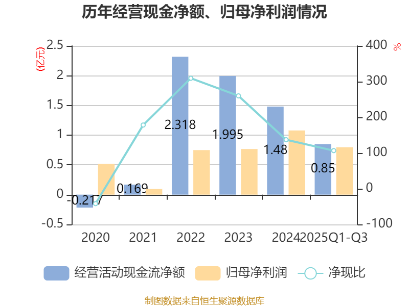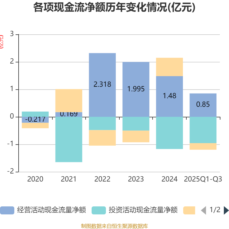 2025年前三季度,公司经营活动现金流净额为8495.13万元,同比增加1.07亿元;筹资活动现金流净额-2393.08万元,同比减少7317.69万元;投资活动现金流净额-9592.53万元,上年同期为-9240.15万元。
