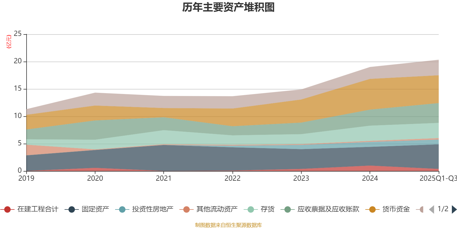资产重大变化方面,截至2025年三季度末,公司货币资金较上年末减少9.52%,占公司总资产比重下降4.55个百分点;固定资产较上年末增加31.99%,占公司总资产比重上升4.19个百分点;在建工程合计较上年末减少62.42%,占公司总资产比重下降3.39个百分点;应收票据及应收账款较上年末增加23.37%,占公司总资产比重上升2.36个百分点。