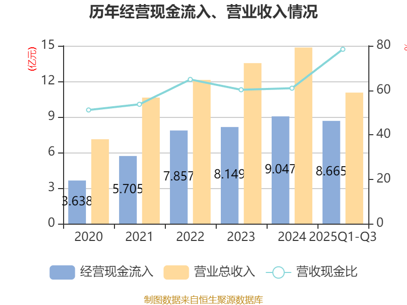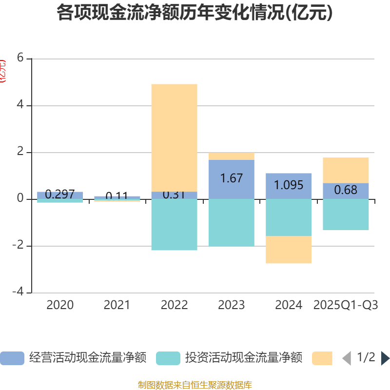 2025年前三季度,公司经营活动现金流净额为6801.81万元,同比下降61.92%;筹资活动现金流净额1.09亿元,同比增加2.92亿元;投资活动现金流净额-1.33亿元,上年同期为-1.19亿元。