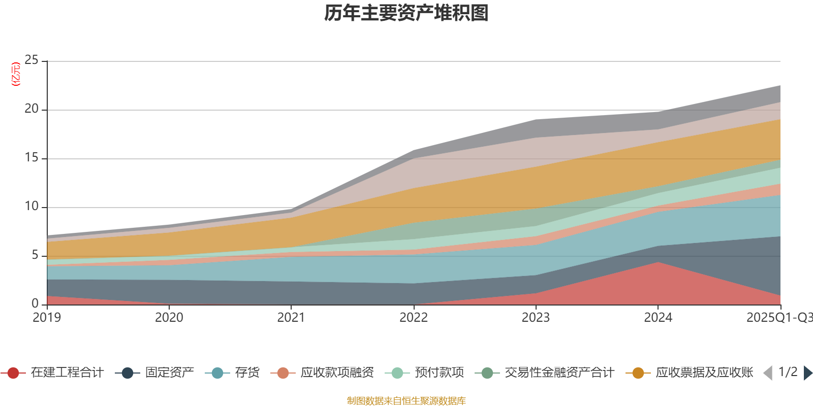 资产重大变化方面,截至2025年三季度末,公司固定资产较上年末增加266.23%,占公司总资产比重上升18.61个百分点;在建工程合计较上年末减少78.95%,占公司总资产比重下降17.96个百分点;应收票据及应收账款较上年末减少7.8%,占公司总资产比重下降4.34个百分点;应收款项融资较上年末增加80.02%,占公司总资产比重上升1.89个百分点。