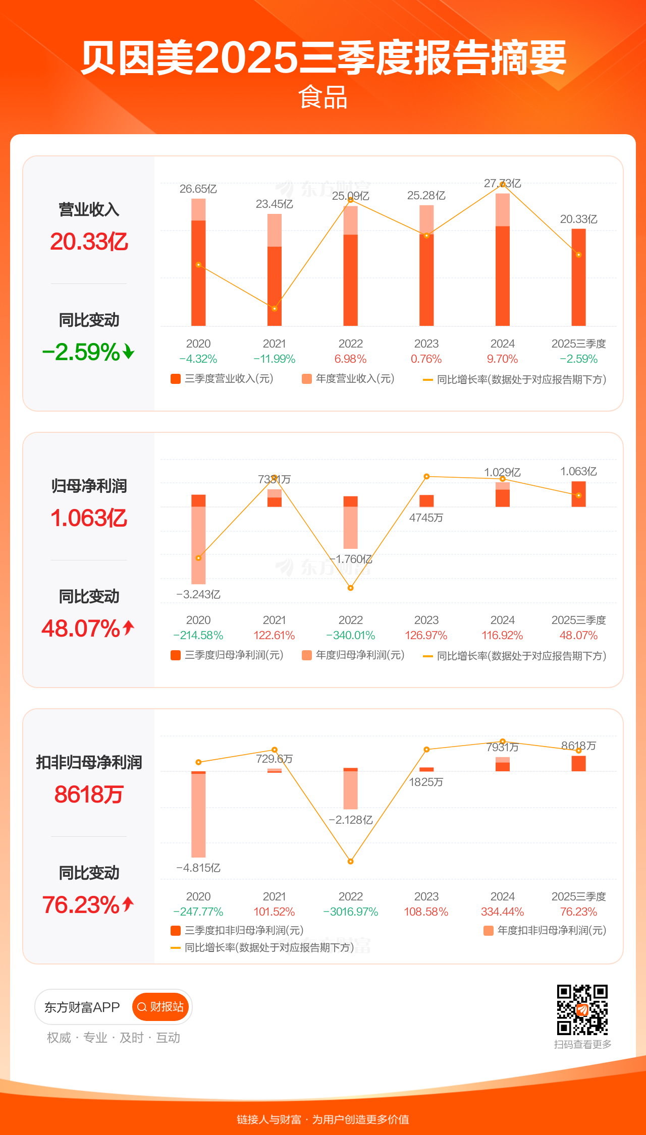 贝因美10月29日发布2025年三季报显示,公司前三季实现营业收入20.33亿元,同比下滑2.59%;归母净利润1.06亿元,同比增长48.07%;扣非归母净利润8618.35万元,同比增长76.23%。