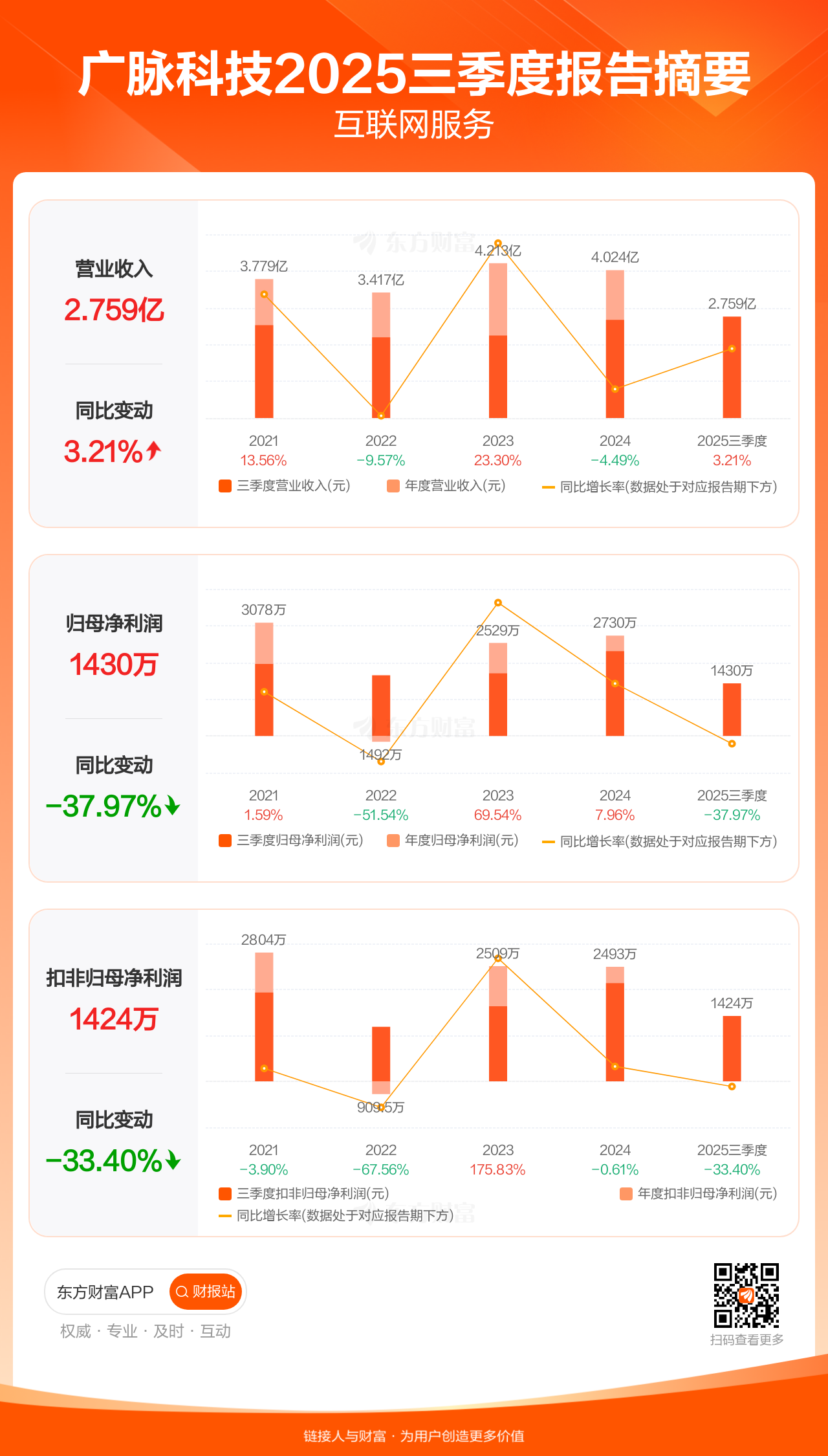 广脉科技10月28日发布2025年三季报显示,公司前三季实现营业收入2.76亿元,同比增长3.21%;归母净利润1429.52万元,同比下滑37.97%;扣非归母净利润1424.25万元,同比下滑33.40%。