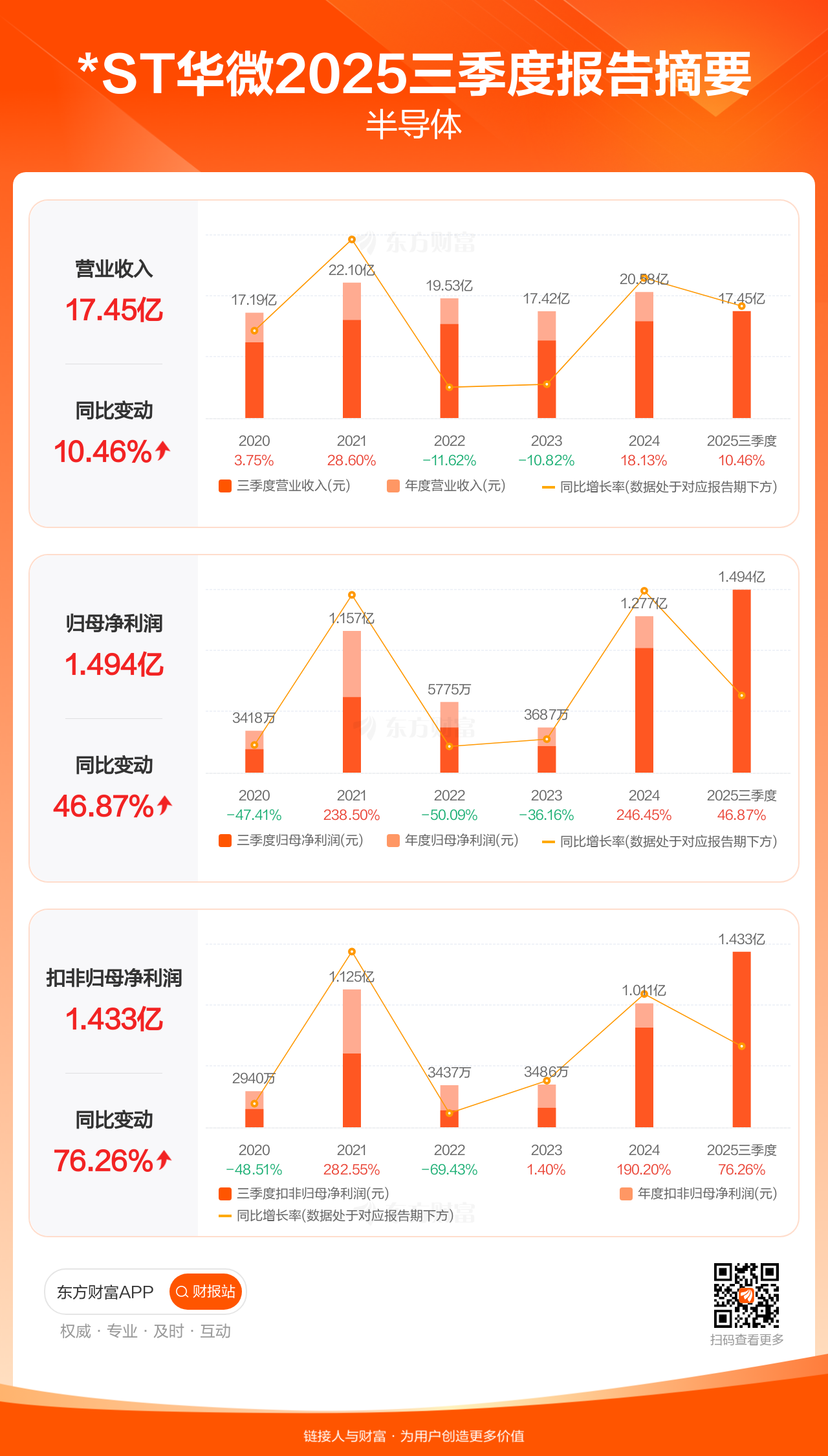 *ST华微10月29日发布2025年三季报显示,公司前三季实现营业收入17.45亿元,同比增长10.46%;归母净利润1.49亿元,同比增长46.87%;扣非归母净利润1.43亿元,同比增长76.26%。