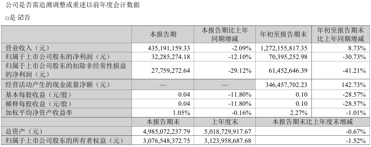其中第三季度,公司营业收入为4.35亿元,同比下降2.1%;归母净利润为3229万元,同比下降12.1%;扣非归母净利润为2776万元,同比下降29.1%;EPS为0.0435元。