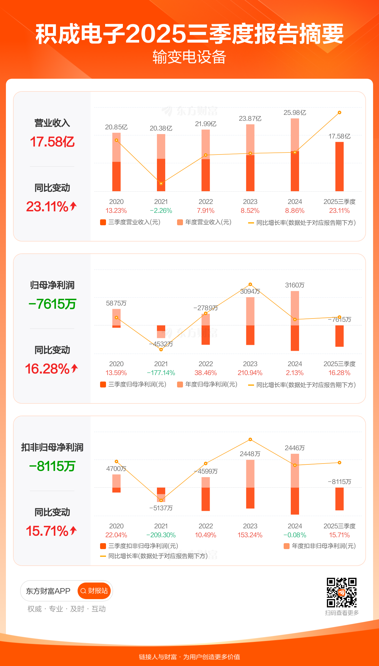 积成电子10月29日发布2025年三季报显示,公司前三季实现营业收入17.58亿元,同比增长23.11%;归母净利润-7614.73万元;扣非归母净利润-8114.54万元。