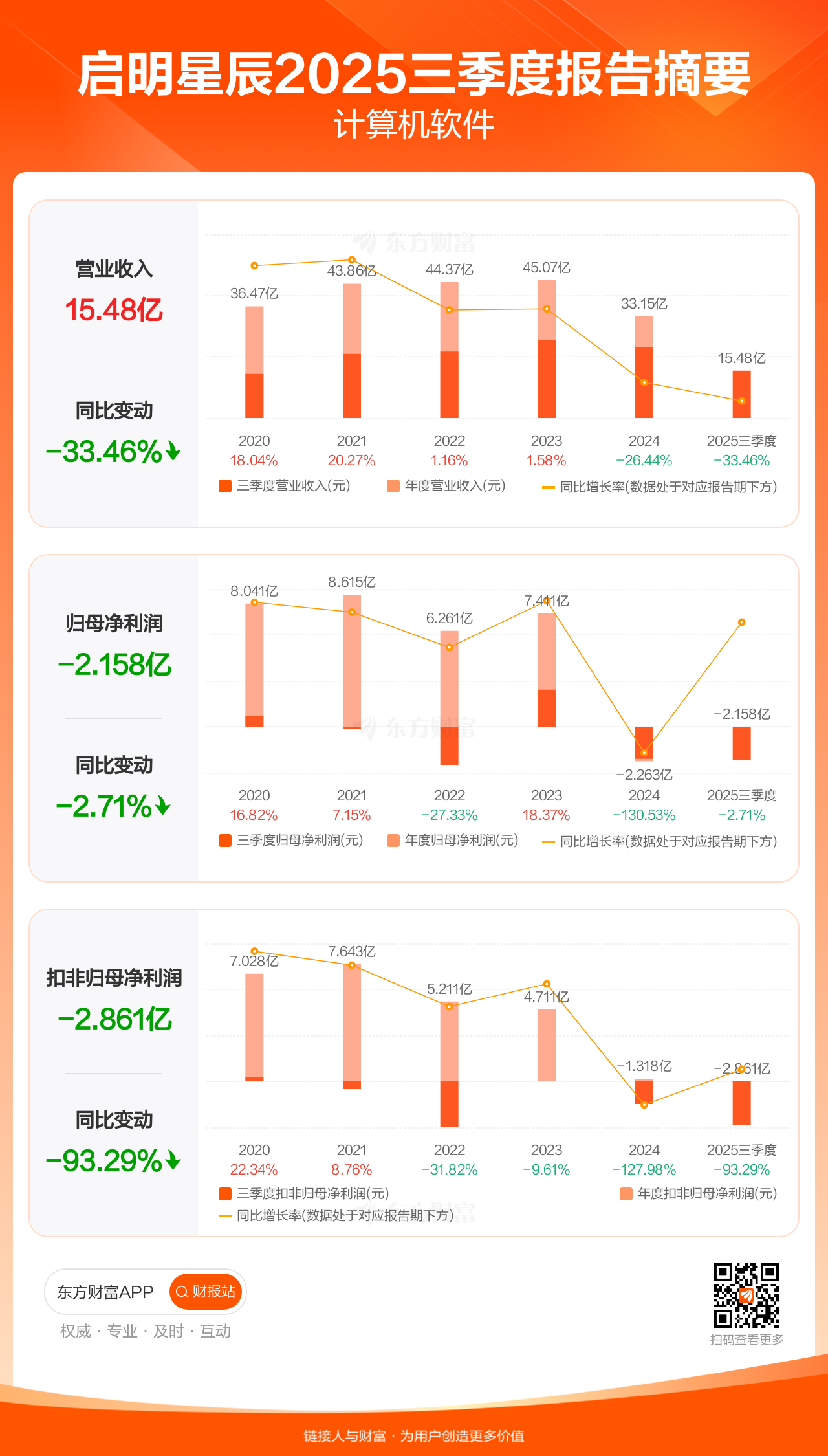 启明星辰10月29日发布2025年三季报显示,公司前三季实现营业收入15.48亿元,同比下滑33.46%;归母净利润-2.16亿元;扣非归母净利润-2.86亿元。