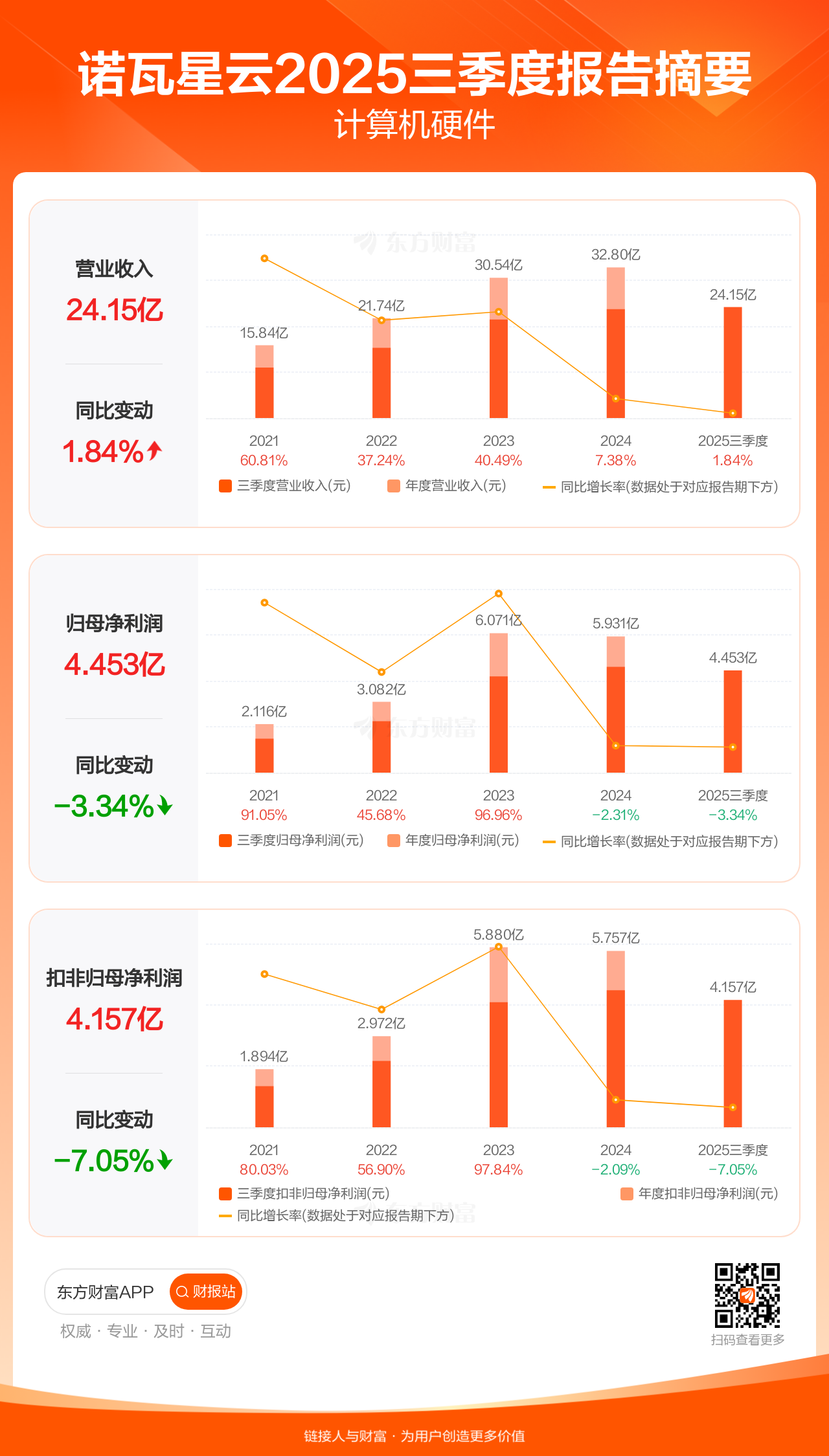 诺瓦星云10月29日发布2025年三季报显示,公司前三季实现营业收入24.15亿元,同比增长1.84%;归母净利润4.45亿元,同比下滑3.34%;扣非归母净利润4.16亿元,同比下滑7.05%。