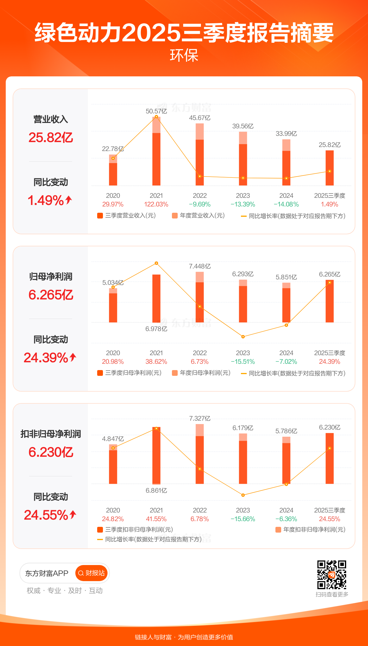 绿色动力10月29日发布2025年三季报显示,公司前三季实现营业收入25.82亿元,同比增长1.49%;归母净利润6.26亿元,同比增长24.39%;扣非归母净利润6.23亿元,同比增长24.55%。