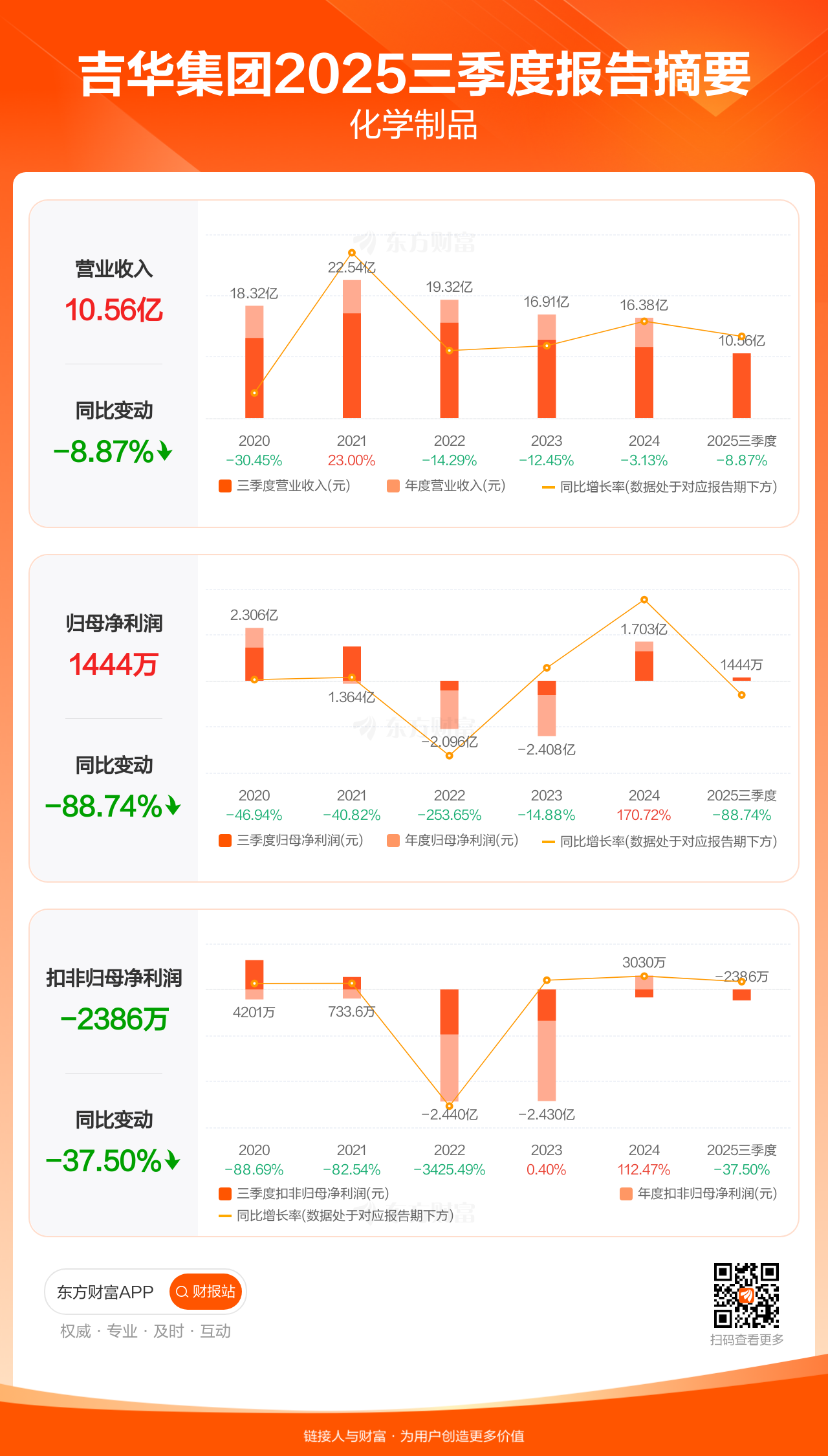 吉华集团10月29日发布2025年三季报显示,公司前三季实现营业收入10.56亿元,同比下滑8.87%;归母净利润1443.94万元,同比下滑88.74%;扣非归母净利润-2386.17万元。