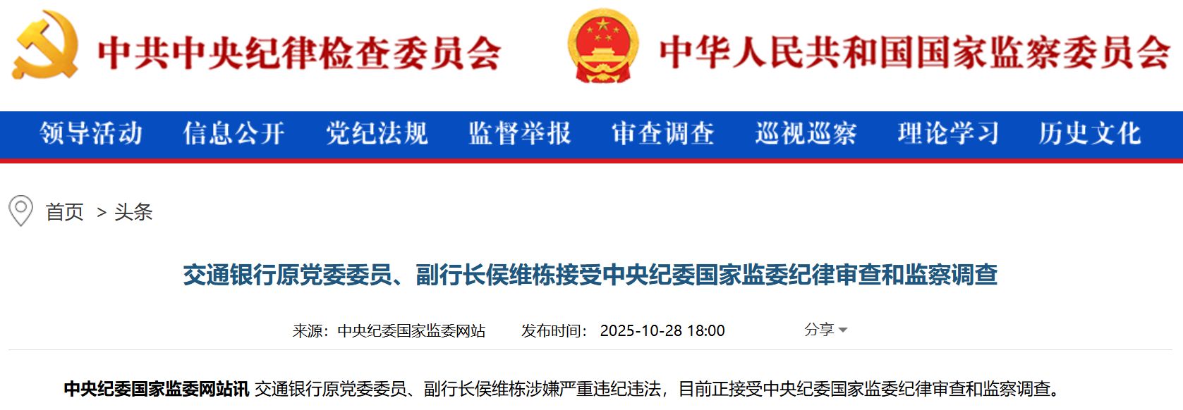 据央视新闻10月28日消息,交通银行原党委委员、副行长侯维栋涉嫌严重违纪违法,目前正接受中央纪委国家监委纪律审查和监察调查。