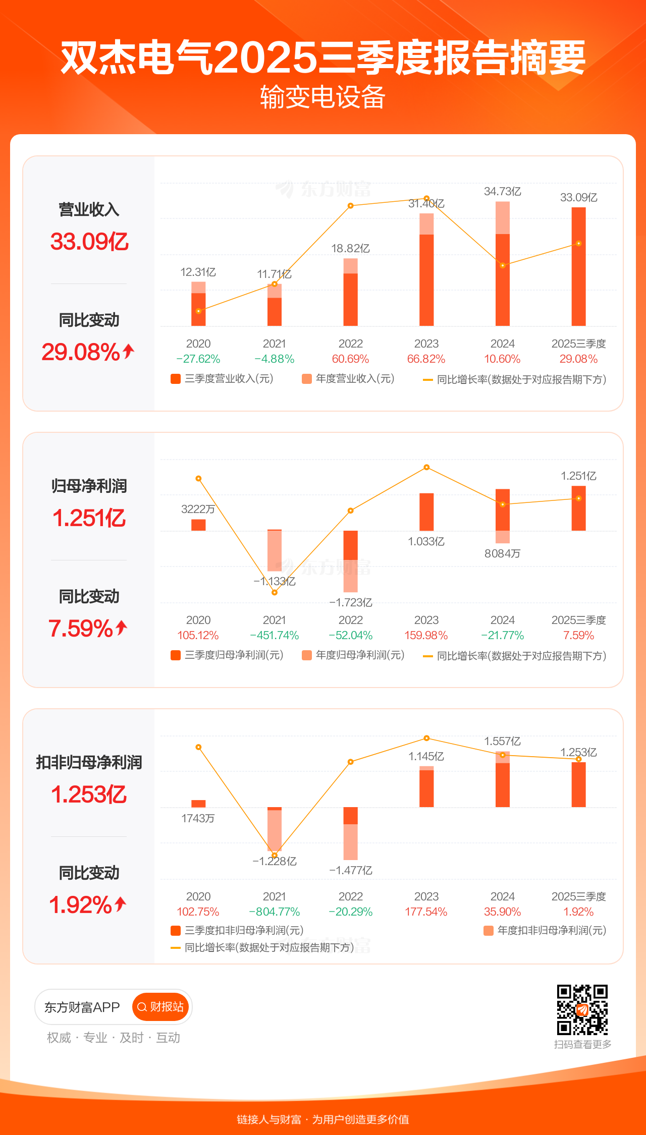 双杰电气10月29日发布2025年三季报显示,公司前三季实现营业收入33.09亿元,同比增长29.08%;归母净利润1.25亿元,同比增长7.59%;扣非归母净利润1.25亿元,同比增长1.92%。