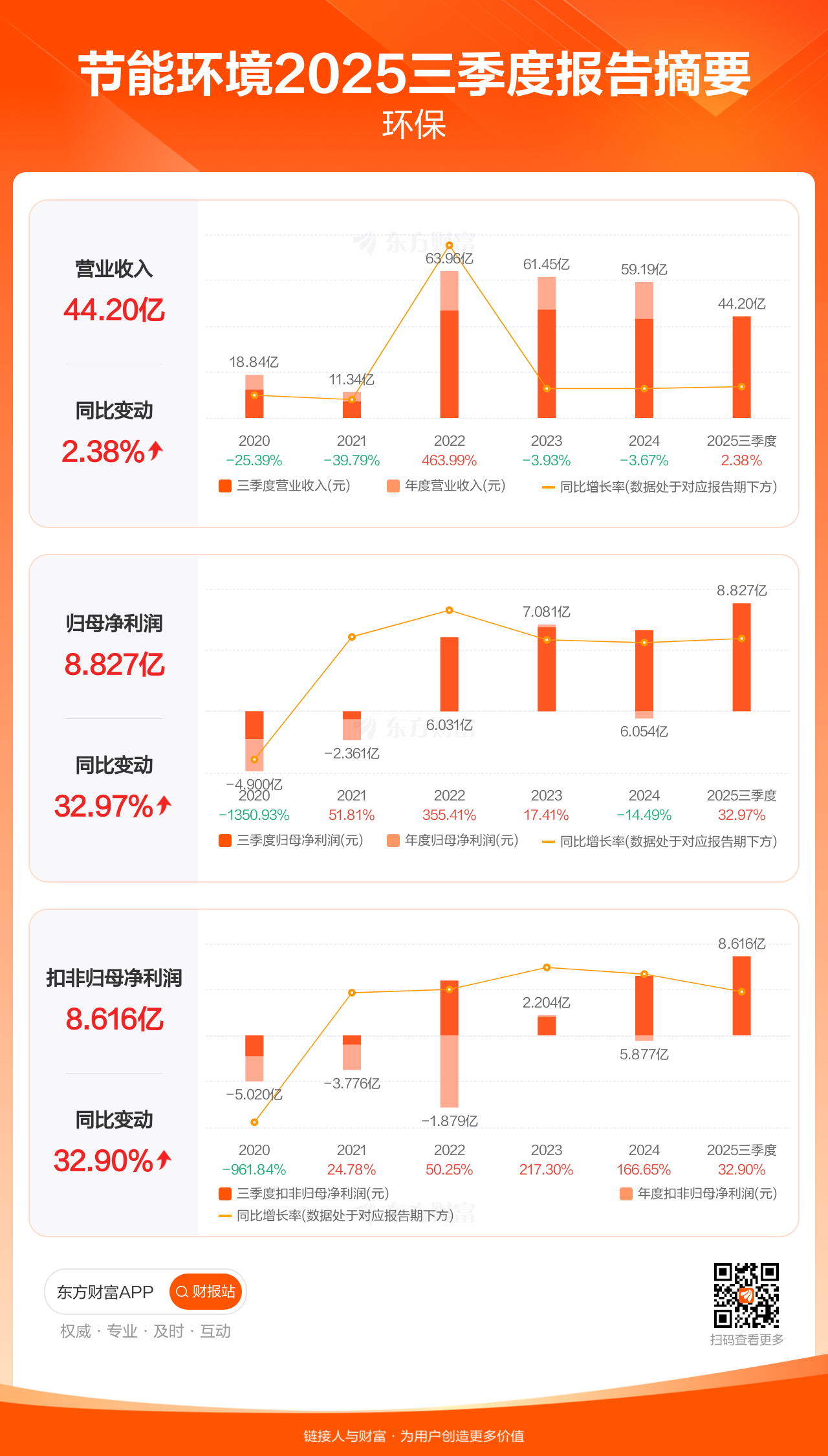 节能环境10月29日发布2025年三季报显示,公司前三季实现营业收入44.20亿元,同比增长2.38%;归母净利润8.83亿元,同比增长32.97%;扣非归母净利润8.62亿元,同比增长32.90%。