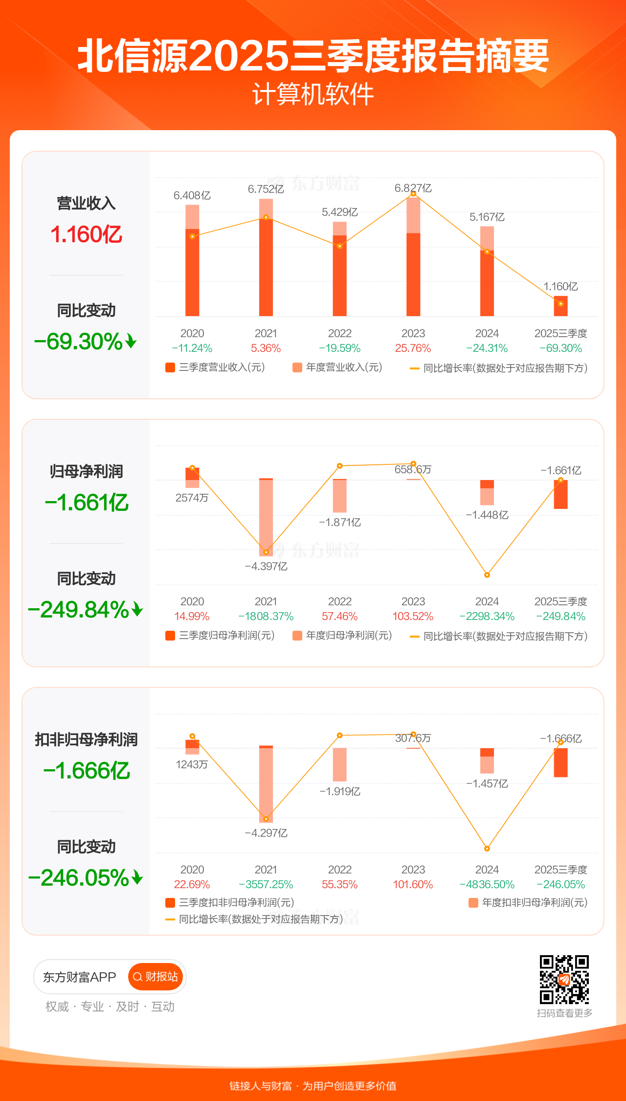 北信源10月29日发布2025年三季报显示,公司前三季实现营业收入1.16亿元,同比下滑69.30%;归母净利润-1.66亿元;扣非归母净利润-1.67亿元。