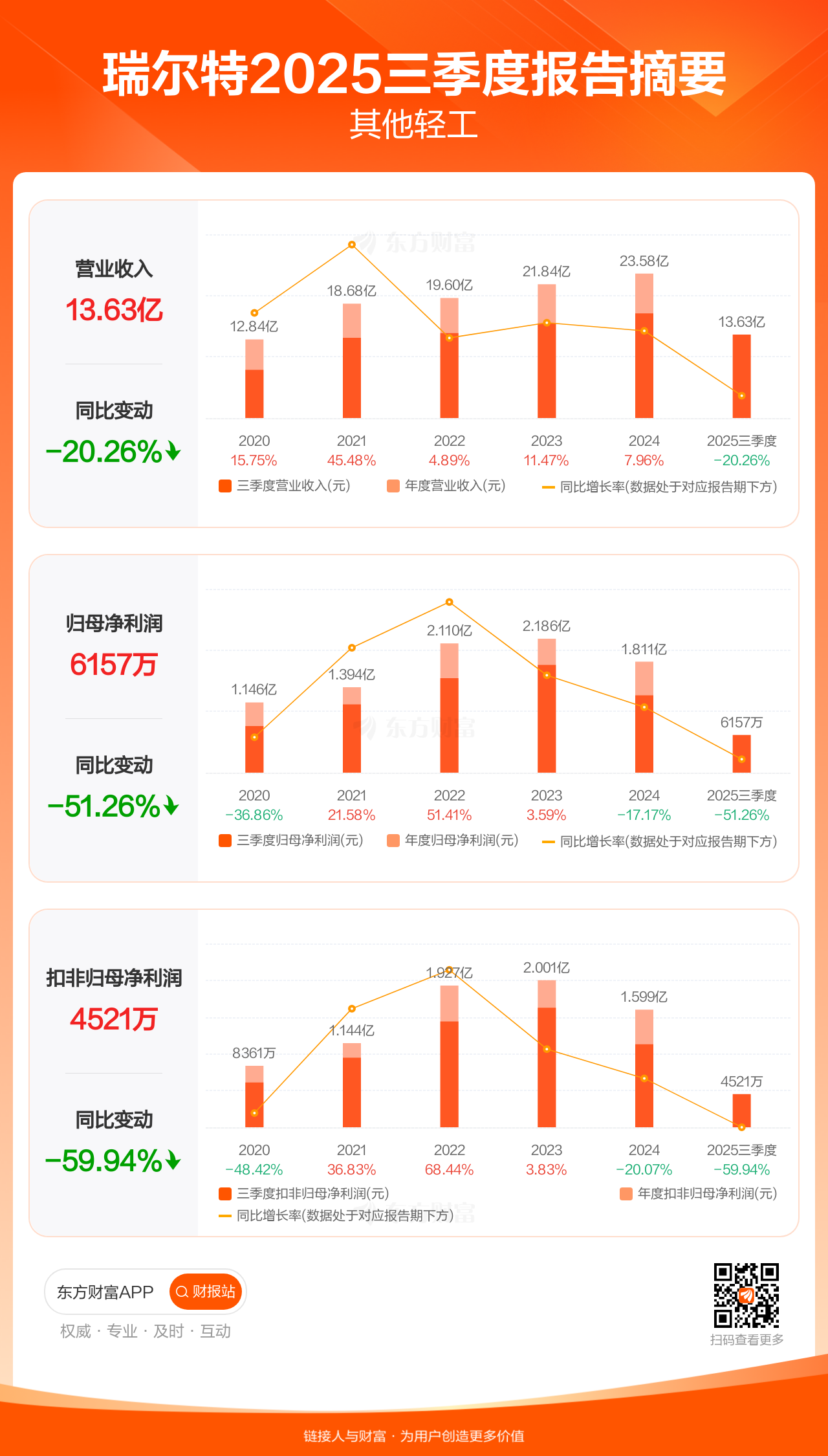 瑞尔特10月29日发布2025年三季报显示,公司前三季实现营业收入13.63亿元,同比下滑20.26%;归母净利润6157.37万元,同比下滑51.26%;扣非归母净利润4521.36万元,同比下滑59.94%。