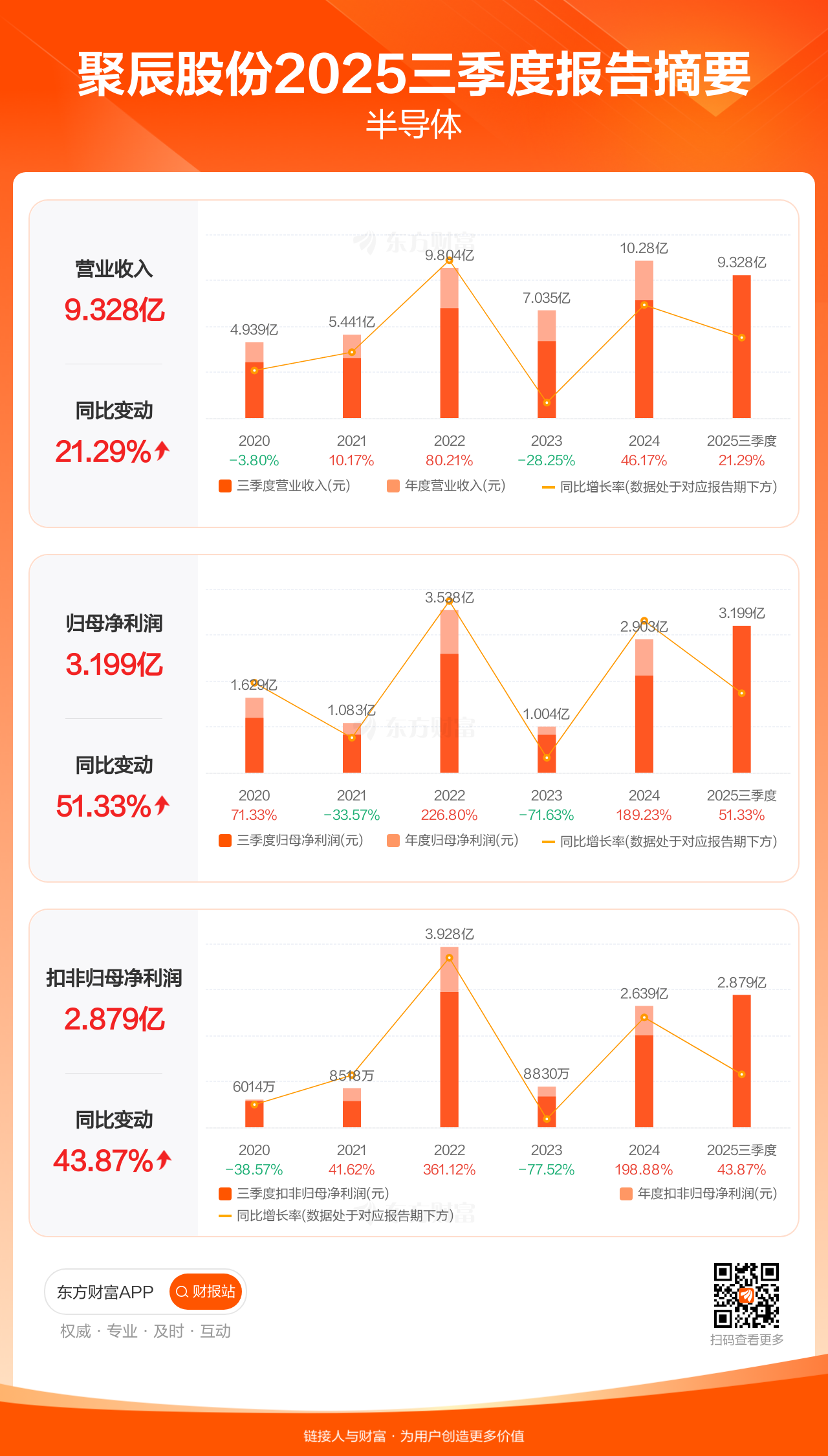 聚辰股份10月29日发布2025年三季报显示,公司前三季实现营业收入9.33亿元,同比增长21.29%;归母净利润3.20亿元,同比增长51.33%;扣非归母净利润2.88亿元,同比增长43.87%。