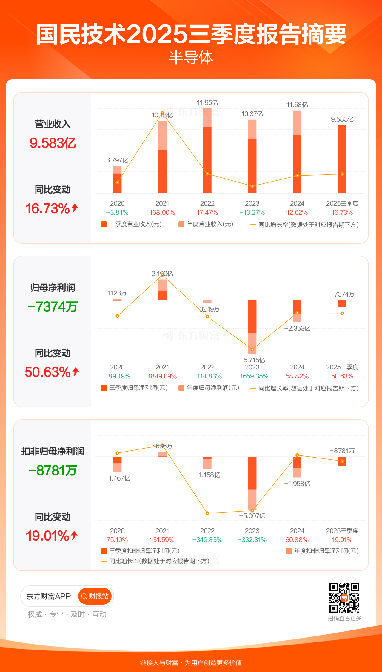 国民技术10月29日发布2025年三季报显示,公司前三季实现营业收入9.58亿元,同比增长16.73%;归母净利润-7374.09万元;扣非归母净利润-8781.33万元。