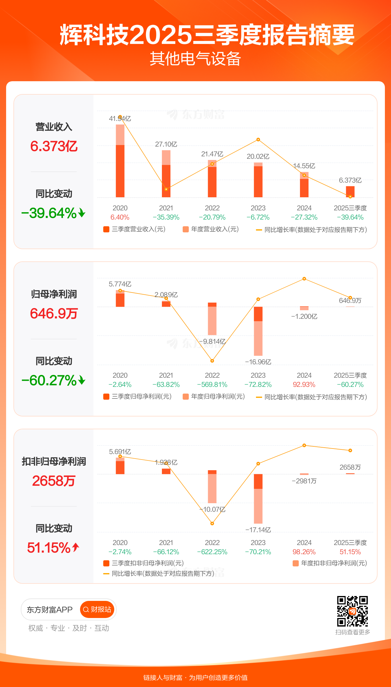 昇辉科技10月29日发布2025年三季报显示,公司前三季实现营业收入6.37亿元,同比下滑39.64%;归母净利润646.90万元,同比下滑60.27%;扣非归母净利润2657.60万元,同比增长51.15%。