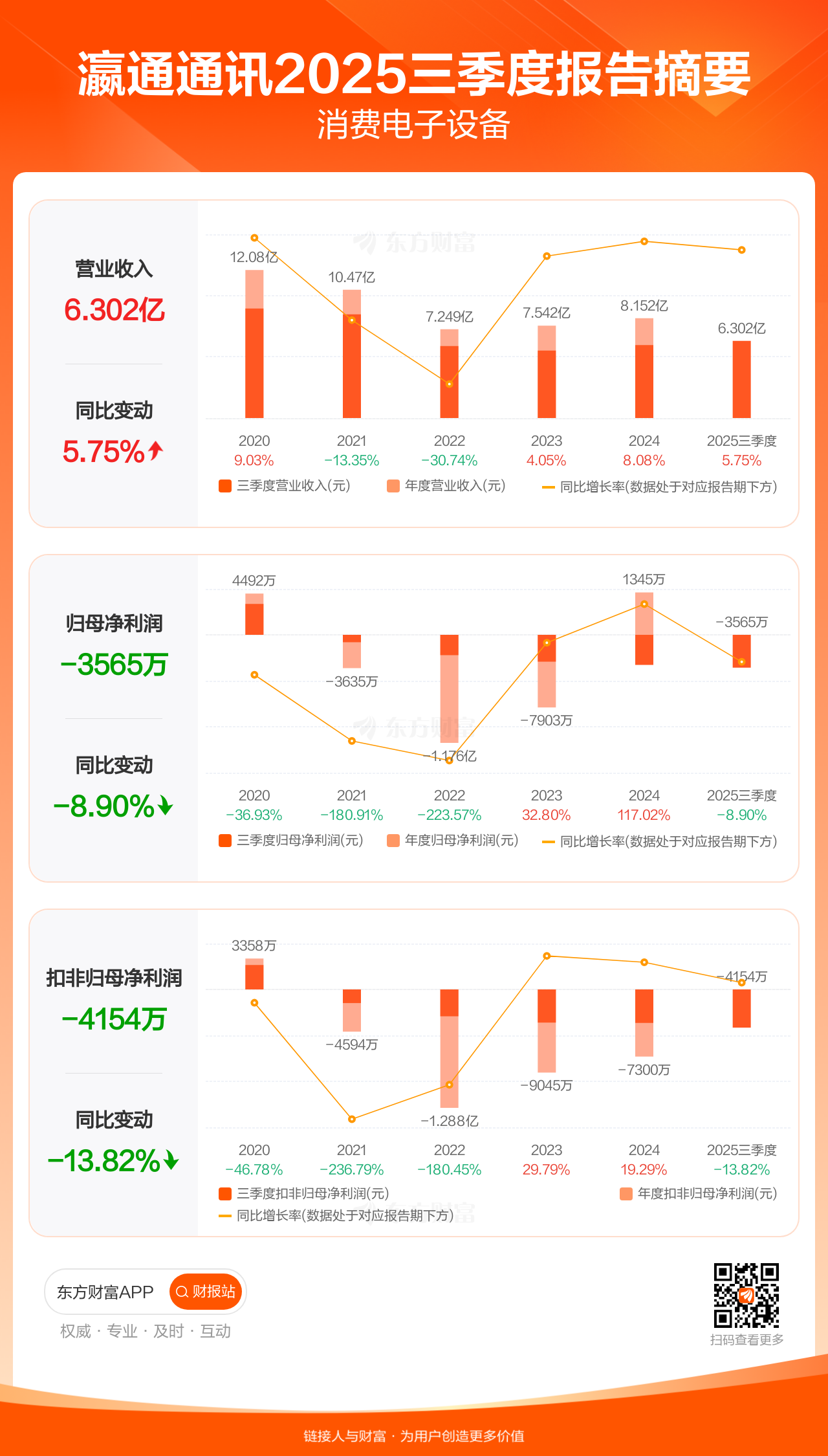 瀛通通讯10月29日发布2025年三季报显示,公司前三季实现营业收入6.30亿元,同比增长5.75%;归母净利润-3565.46万元;扣非归母净利润-4154.44万元。
