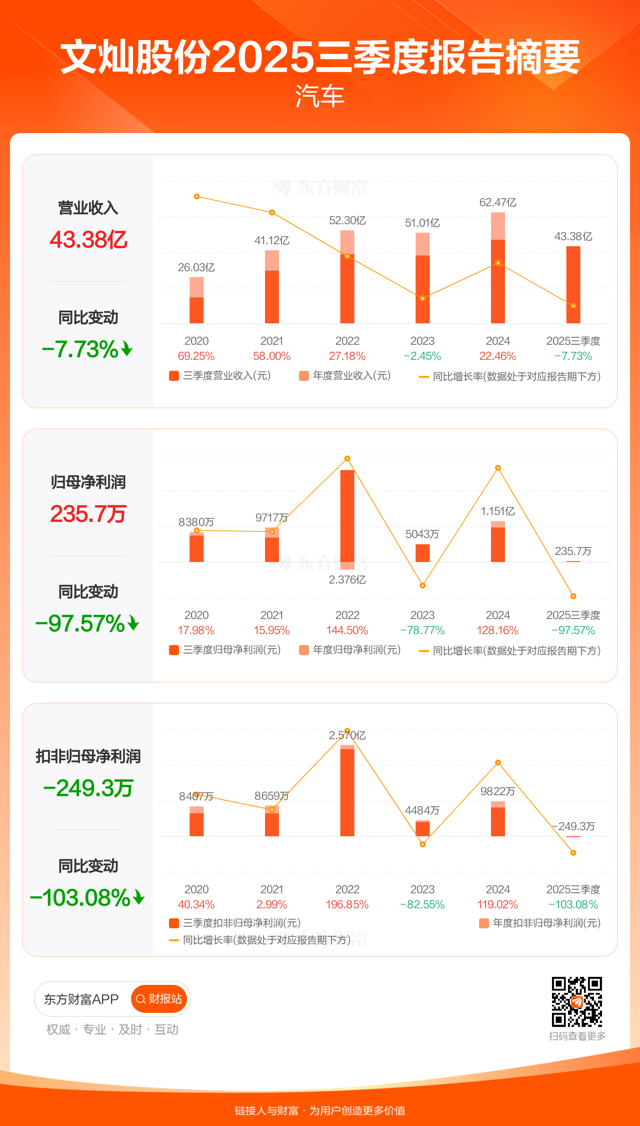 文灿股份10月29日发布2025年三季报显示,公司前三季实现营业收入43.38亿元,同比下滑7.73%;归母净利润235.74万元,同比下滑97.57%;扣非归母净利润-249.33万元。